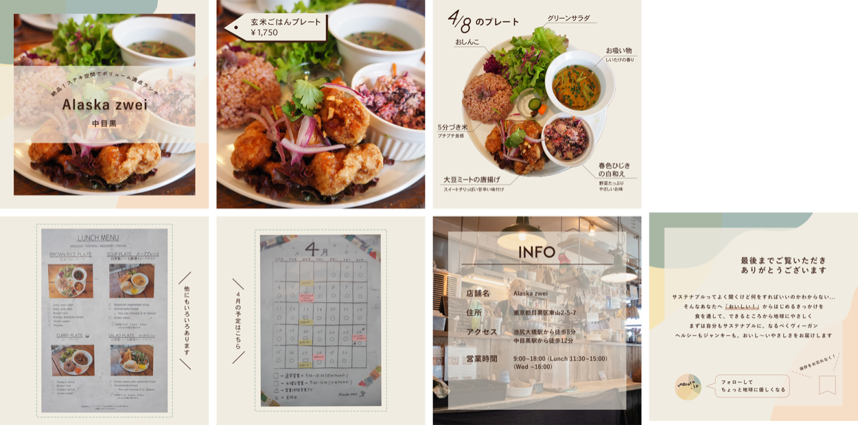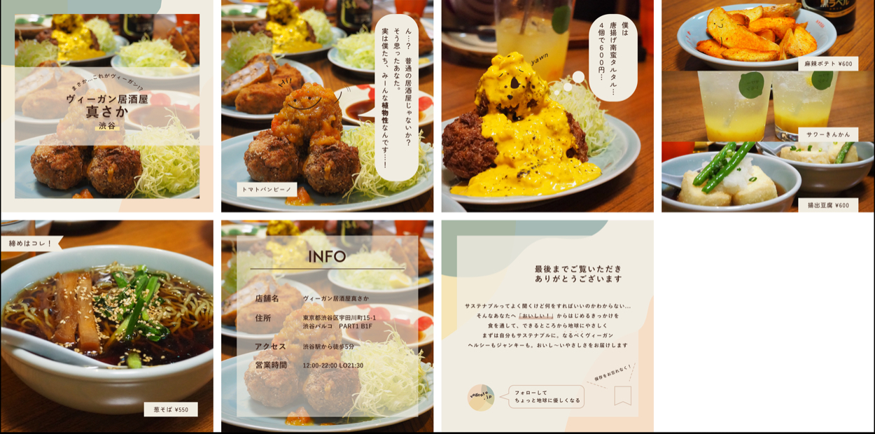 「サステナグルメ」と称してヴィーガン・ベジタリアン対応のレストランやカフェを紹介するinstagramアカウントを運営していました。その際に制作した投稿画像です。