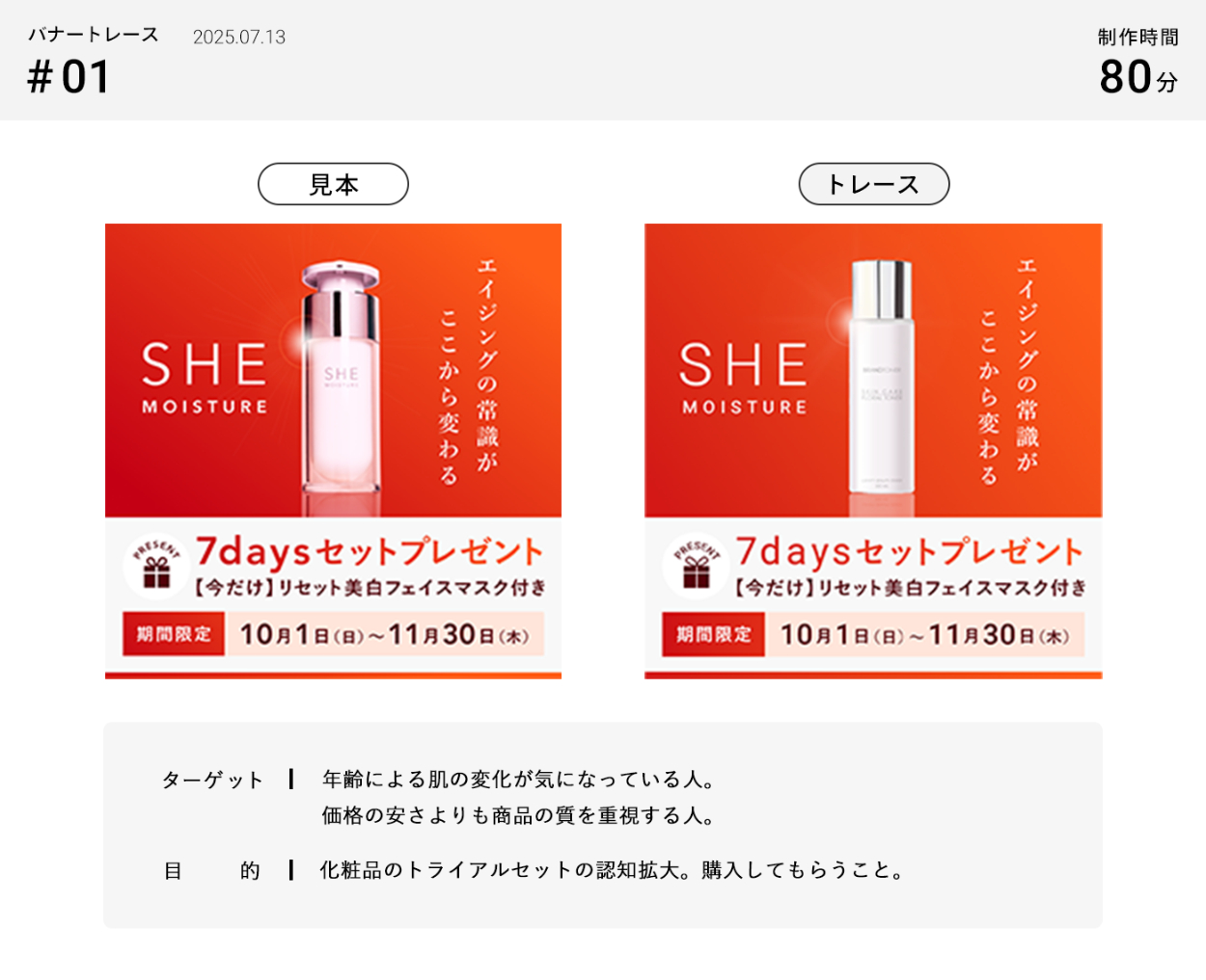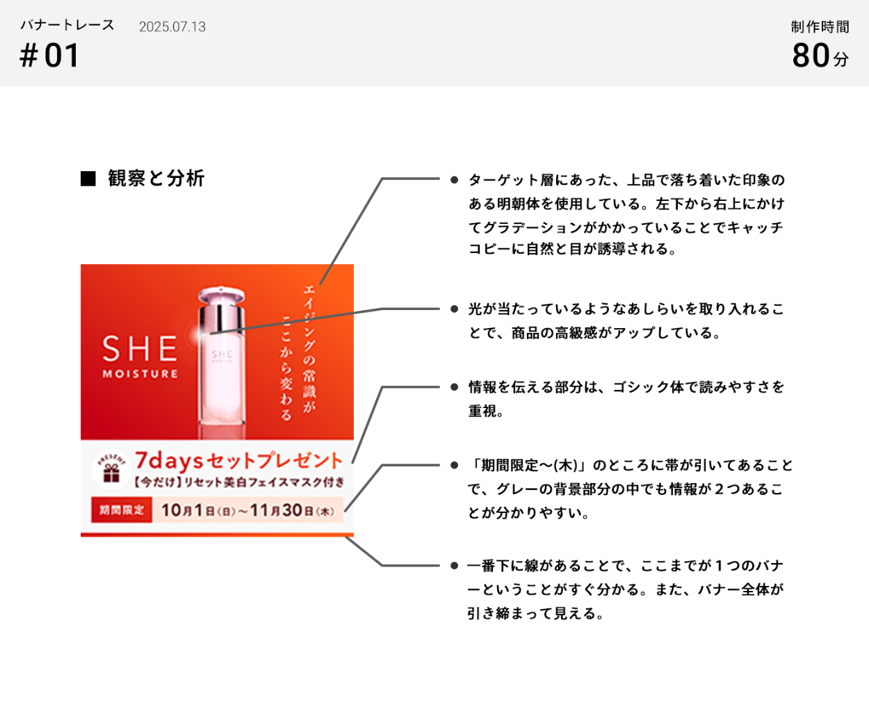 - トレースの際は、ツールの使い方、カーニング、あしらいなど見えているものだけを学ぶのではなく、そこからバナーの目的やターゲットについて読み取り、だからこのデザインなんだと結び付けて考えることが重要である。