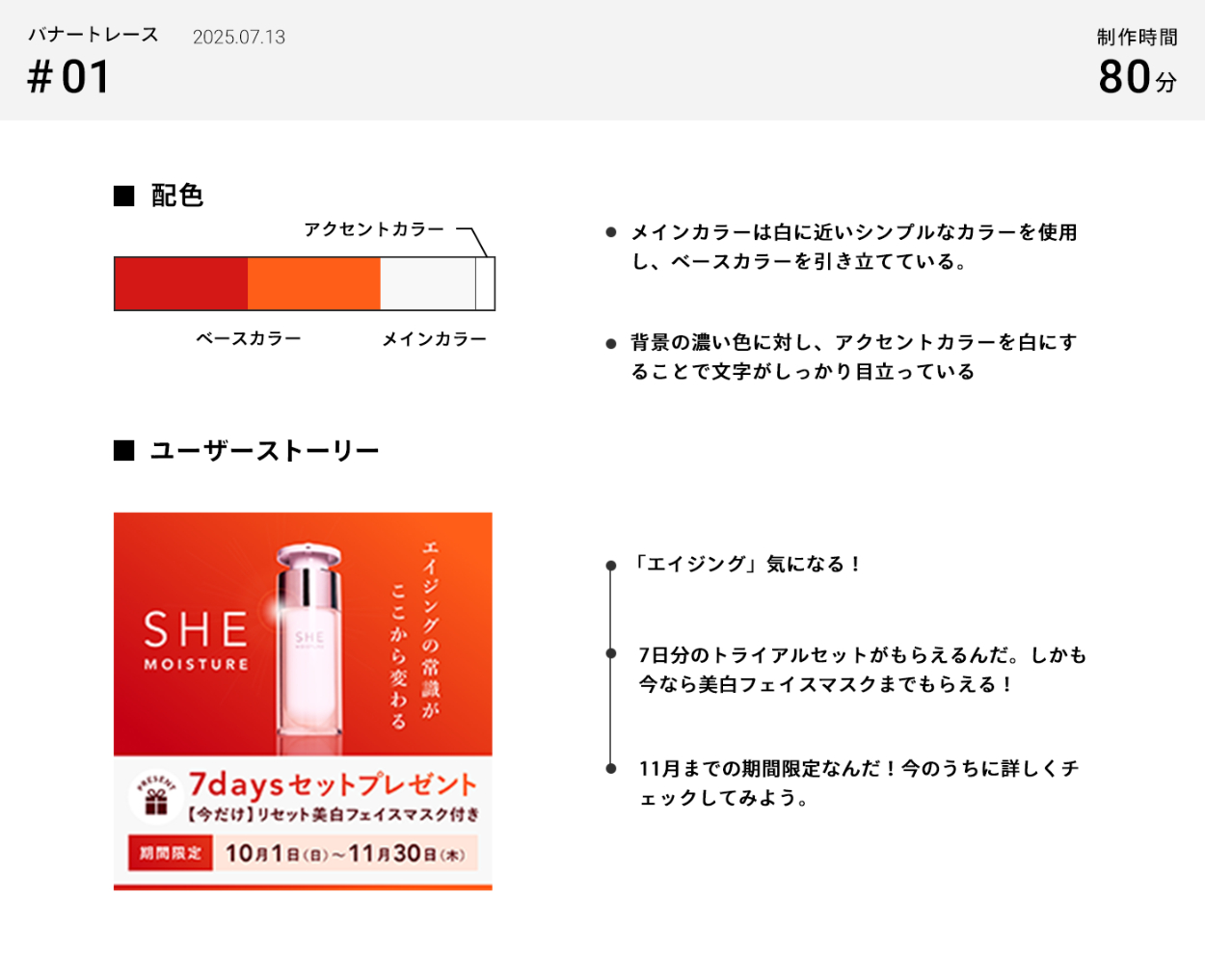 実案件を想定した演習プログラム「SHElikes PRO デザイナー」にてバナートレースに取り組みました。またバナートレースで得た学び(情報設計や配色・ビジュアルデザイン等)を3枚のクリエイティブにまとめました。