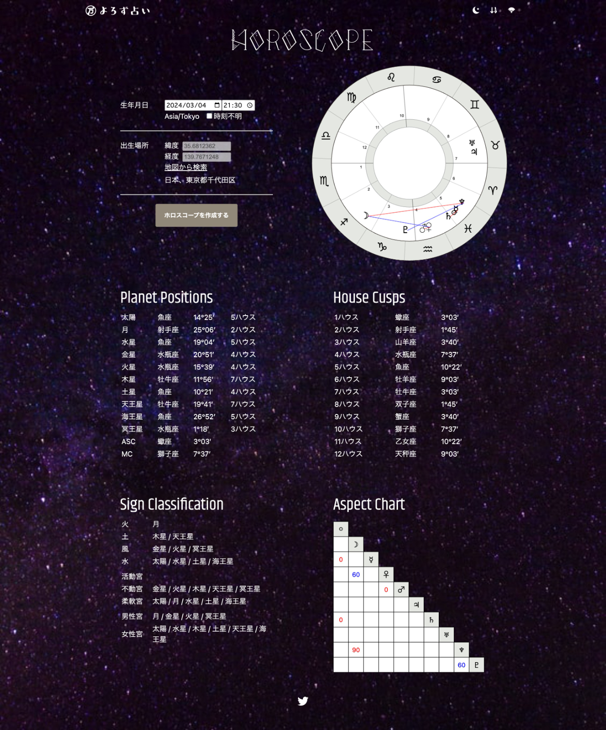 誕生日や生まれた場所などを元に、占いに必要なデータを算出するアプリです。