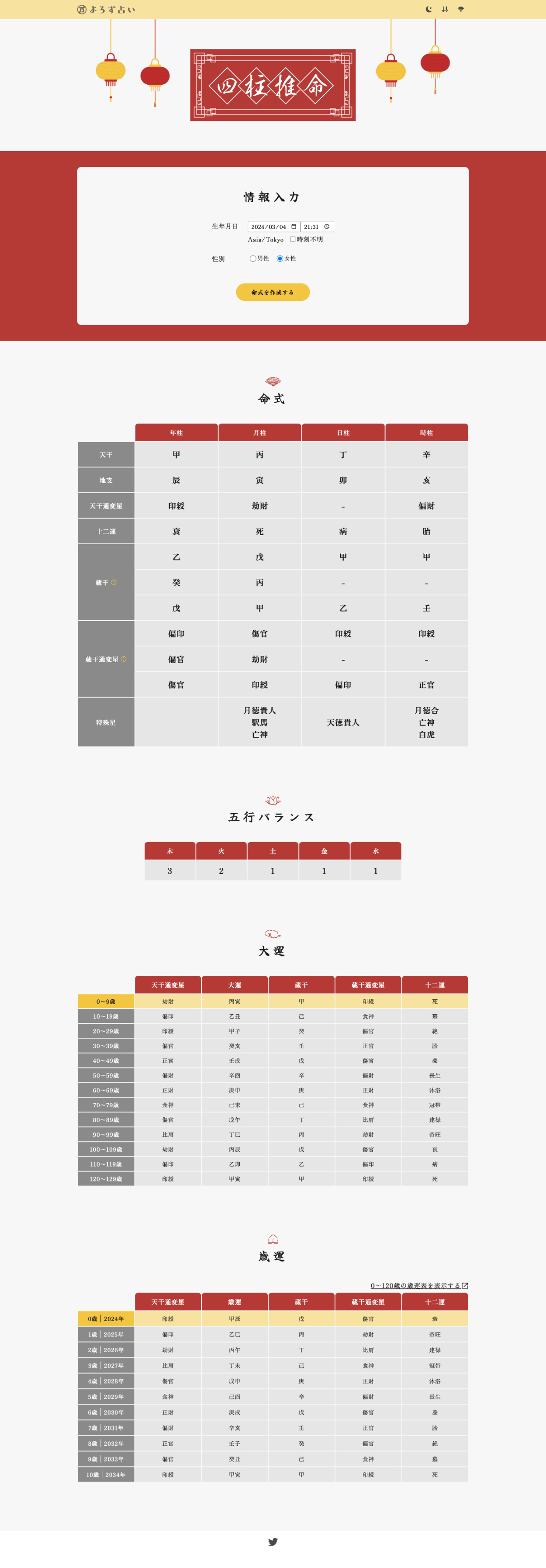 計算結果の情報量が他の占いと比べかなり多いため、見やすくするための工夫として、現在に該当する行の背景色を変えたり、スマホ表示にした場合も見やすく、画面崩れ等が無いよう考慮しました。