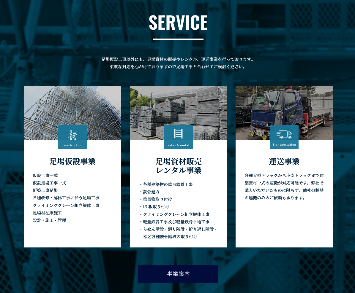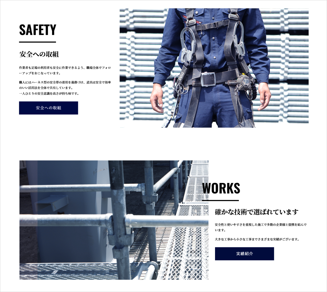 「安全への取り組み」や「実績紹介ページ」を設け、簡潔な説明文をトップページに掲載しました。これらのページへのリンクを張ることで、トップページから下層ページへのハブページとしての機能も果たしています。