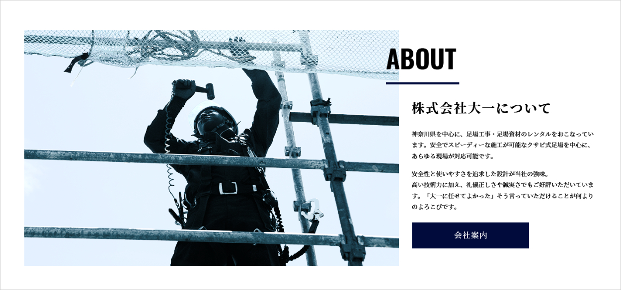 BtoB企業であるためどこで何をやっている会社なのかが一目でわかった方がよいと判断しました。訪問者がすぐに会社の概要を把握できるよう、メインビジュアル内に地区名と会社概要をはっきりと明記しました。