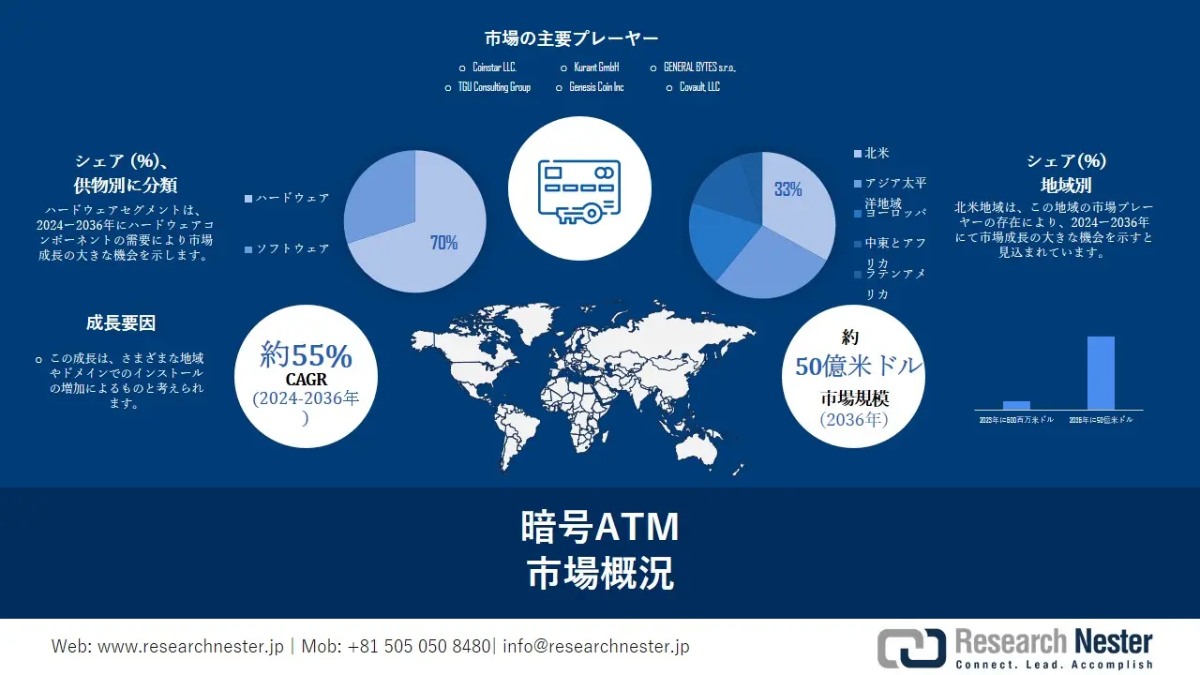 暗号ATM市場: 業界、規模、シェア、傾向、予測2036年 akiraizanagii OVERVIEW 暗号ATM市場調査、規模、傾向のハイライト(予測2024-2036年) 暗号ATM市場の規模は、2036年末までに50億米ドルを超える見込みます。2024 ― 2036 年の予測期間中に約 55% の CAGR で拡大します。2023 年の暗号ATMの業界規模は 600百万米ドルを超えました。設置台数の急増がビットコイン現金自動預け払い機市場の拡大を促進しています。 日本の暗号ATM市場は、2024―2036年間に大幅に成長すると予想されています。日本にはテクノロジーに精通した人口が多く、投資や決済手段としても仮想通貨への関心が高まっています。 WEBSITE