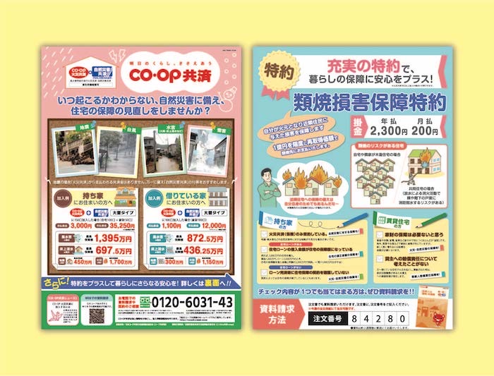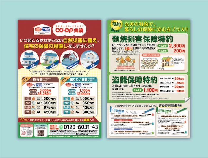 コープ共済(災害保険)チラシ作成 伊藤 グラフィックデザイナー/イラストレーター OVERVIEW コープ共済の仕事を何件かさせていただいていたのですが、その中の一つです。 別バージョンです。従来のチラシよりもパステル系の色を使ったり、読み込まなくてもパッと見て何かわかりやすいようなデザインにしました。
