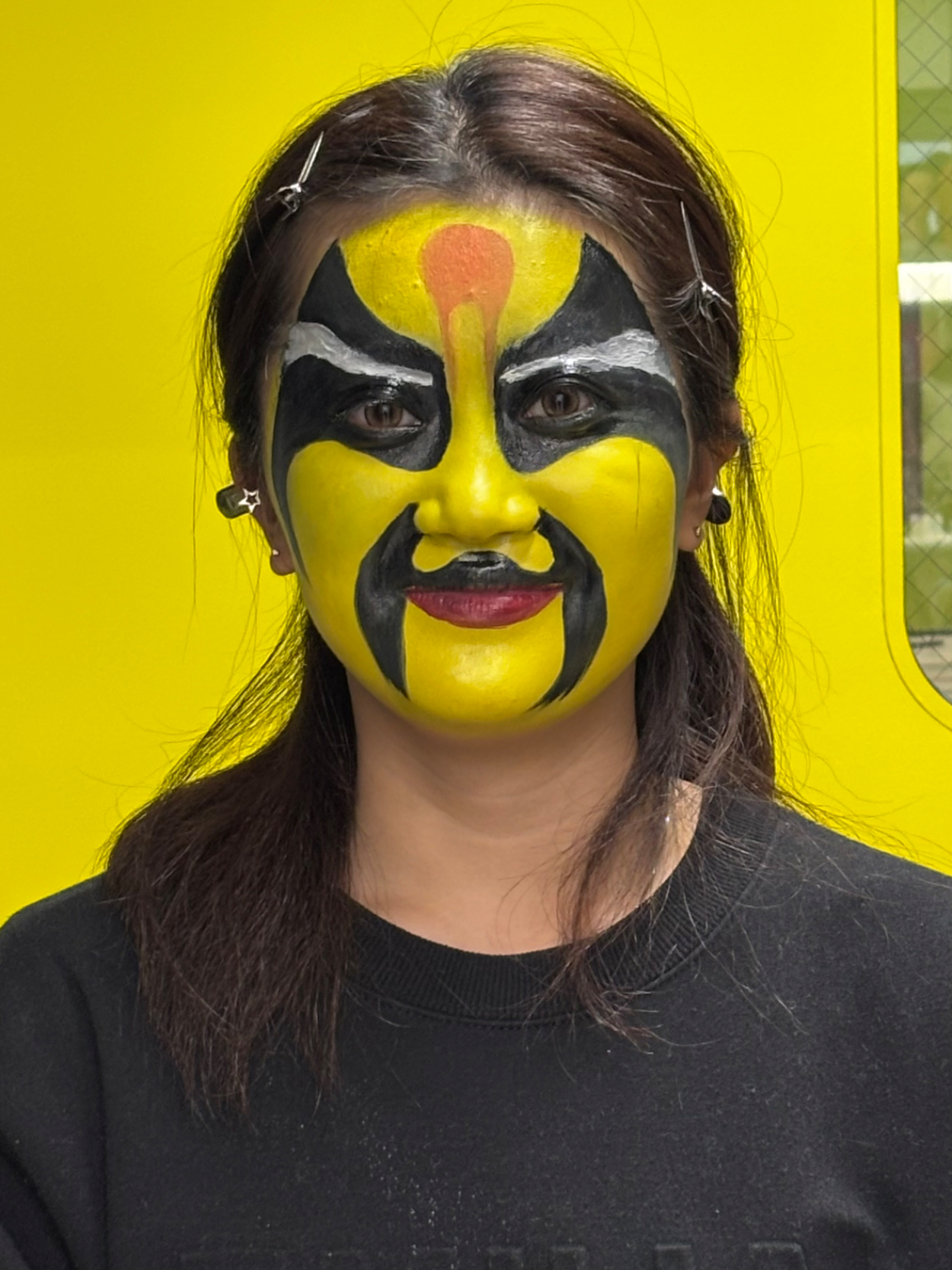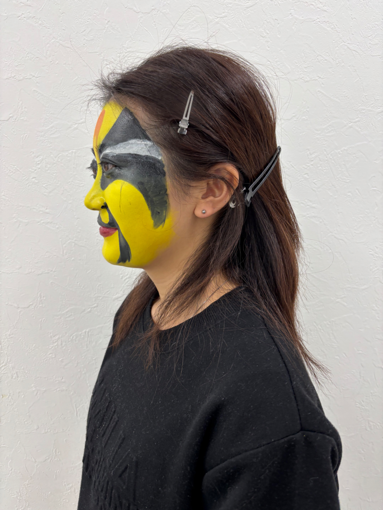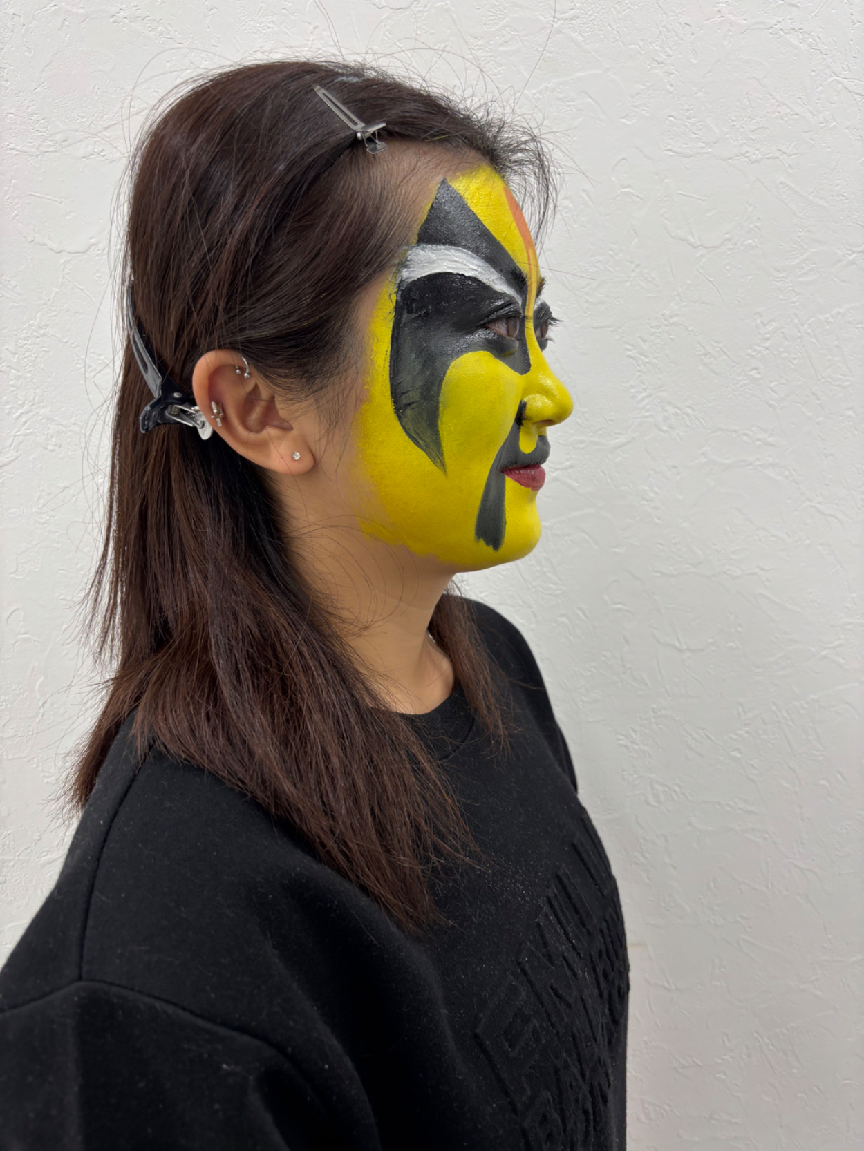黄色が持つ勇猛さや荒々しさを意識し、強い存在感を表現しました。左右のバランスと線の明瞭さを意識し、舞台映えする構成に仕上げました。