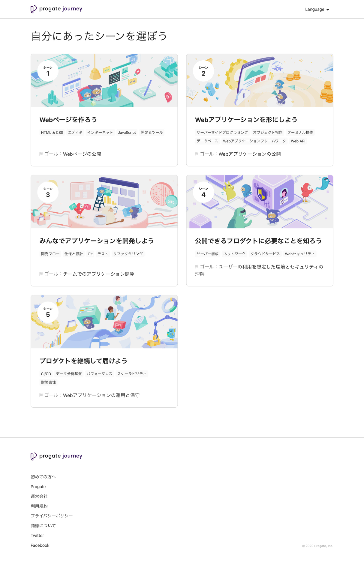 【Progate】開発ロードマップ 前嶋 瑠似 Webコンテンツデザイナー OVERVIEW プログラミングを学んでいる方に向けたWebプロダクト開発学習ロードマップ YEAR 2020 イラストと図解作成を行いました。https://journey.prog-8.com扉イラストロードマップを5つのシーンに分け、それぞれのシーンが一目でどんな状態を目指しているのかイメージしやすくしました。広がりのある世界観にしたく、奥行きや角度を意識して作成しました。 WEBSITE