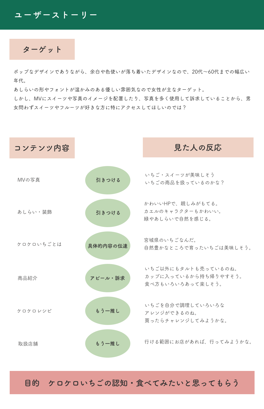 課題の内容とは別に、今回のサイトのターゲット・目的・ユーザーストーリーについて、どのように考えて設計されているのかを考察し、分析しました。