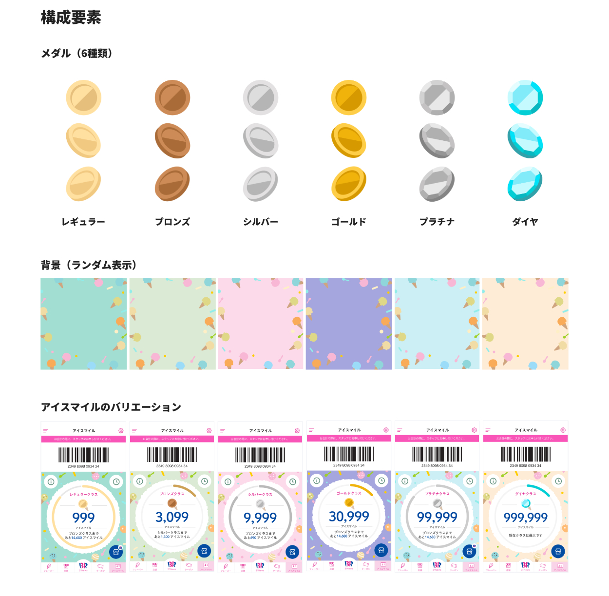 来店スタンプはただ数字の並びでは何も面白くない!と思ったのはイラストのバリエーション。初期のデザインはかなり地味だったが、数字の位置、並び角度、スタンプのバリエーション、そしてランダムで表示することで楽しさの表現ができた。デザイン以外開発者と細かく連携し、スタンプの位置と角度の調整してくれることでデザイン通りに実現できた。