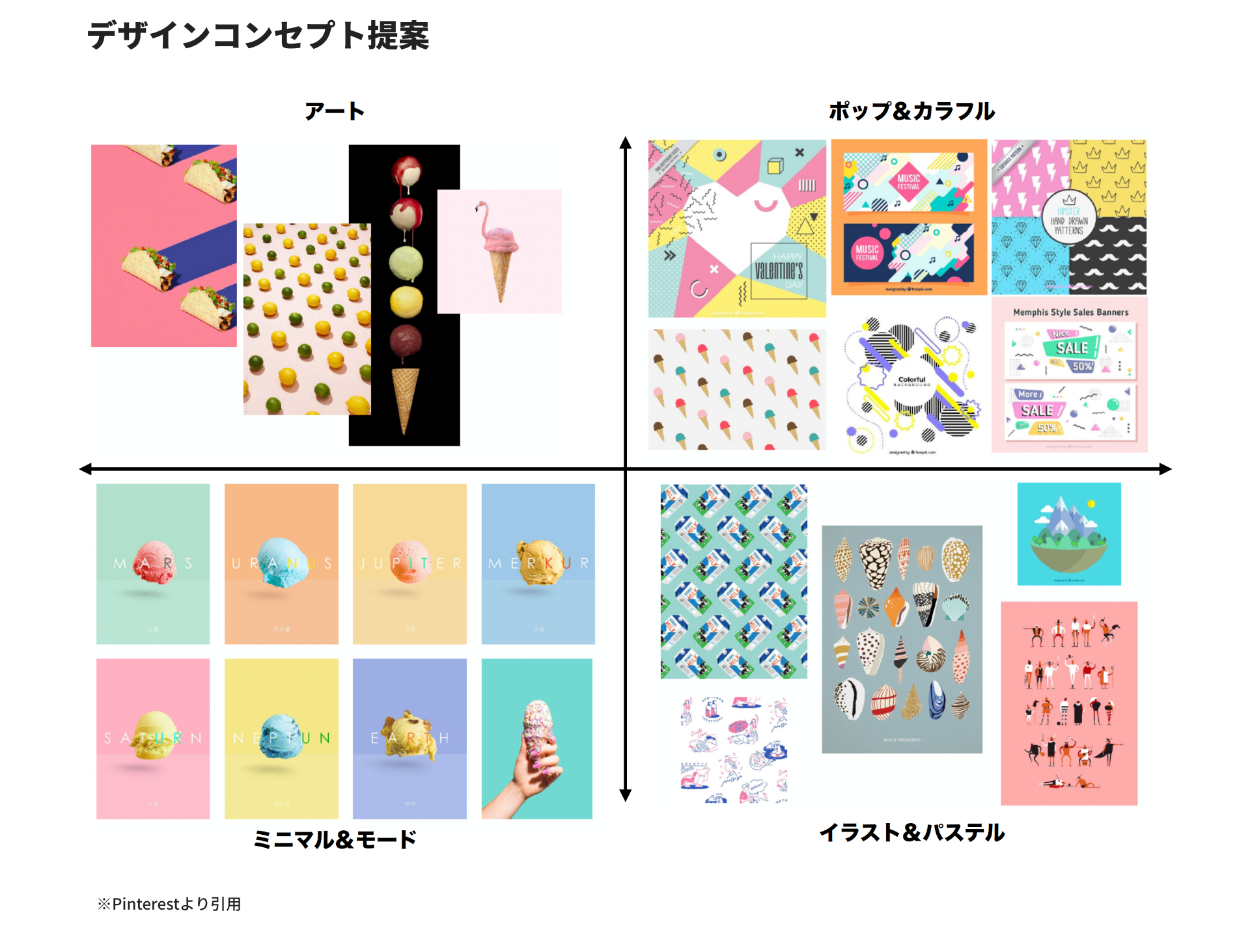 かわいいの範囲から深掘りして、パステルカラーの定着するまでビジュアル提案を行った。