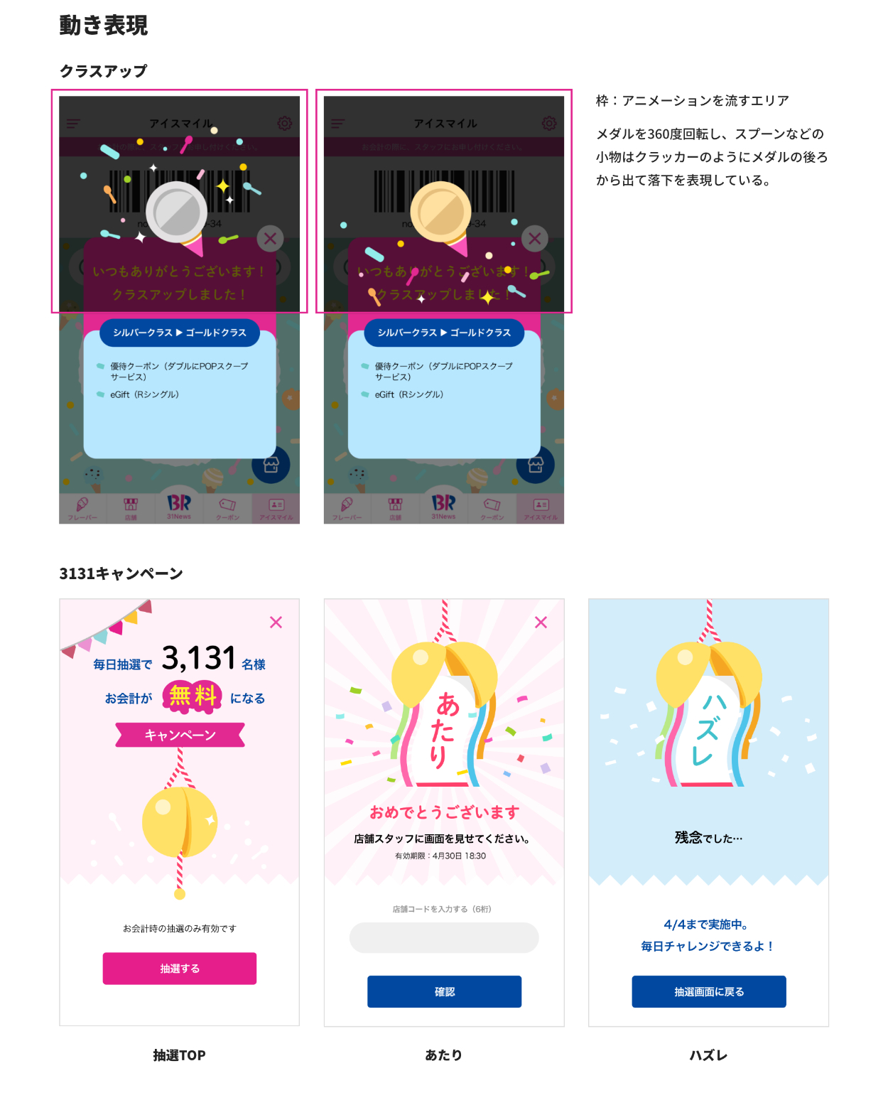 このアプリリリース後のプロモーションキャンペーンの抽選イベントにも同じ「あたり」と「ハズレ」はアニメーションで表現していた。