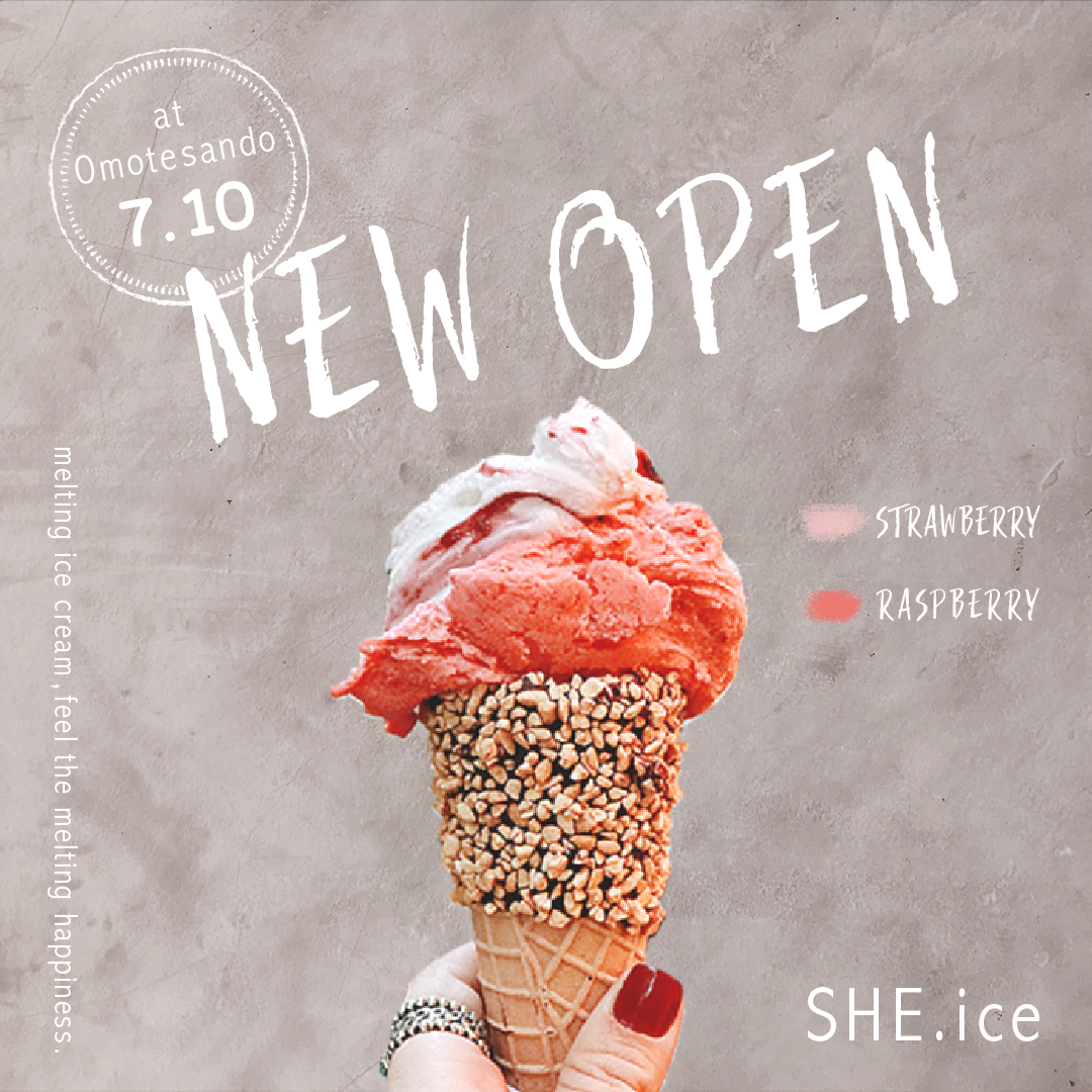 ◇マスト要件:NEW OPEN / 7.10(開店日)/ at 表参道(ローマ字可)/ SHE.ice / キャッチコピー(任意)