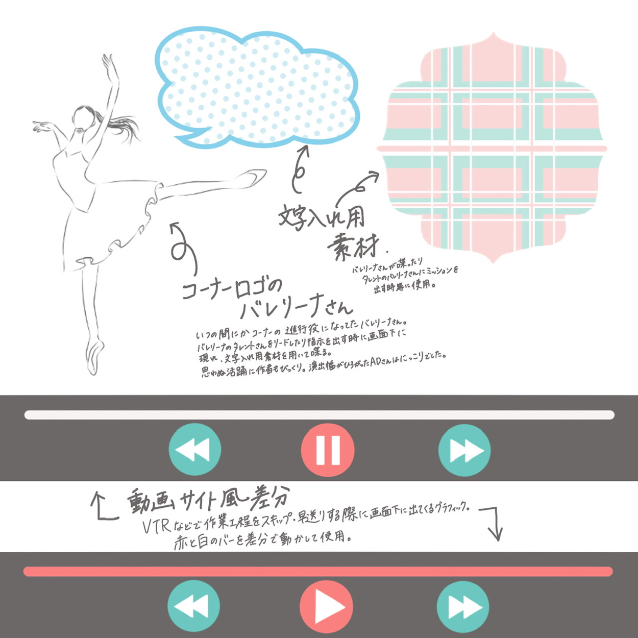 このロゴは担当のADさんもバレリーナさんも気に入ってくださったとの事で、コーナー内に使えそうな素材グラフィックも追加でご用意させていただきました。