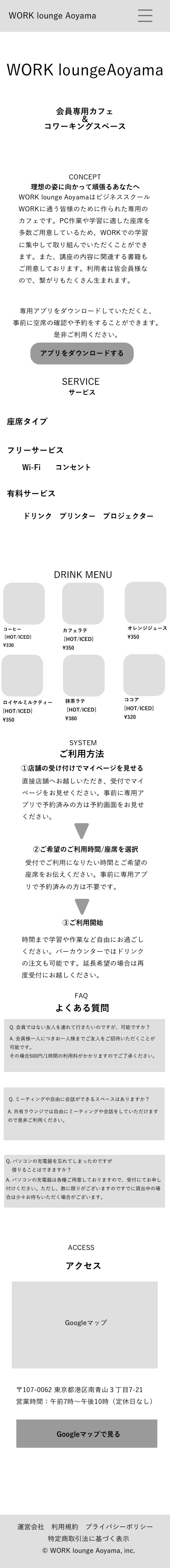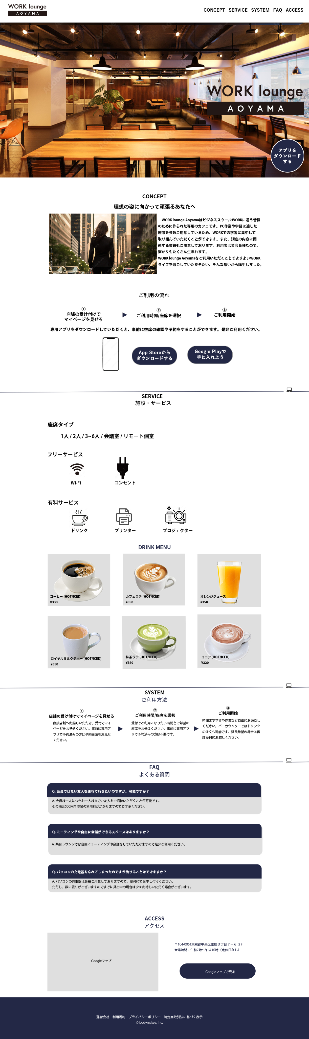 元のワイヤーフレームではコンセプトの次にドリンクメニューが来る流れでしたが、ドリンクメニューの前に、利用手順や使用できるサービス内容を記載する流れにブラッシュアップしました。簡単な利用方法や充実した施設の内容の情報をを先に提示することで、LPをみたユーザーの興味をより惹きつけるためです。加えて、認知とともに会員を増やしたいというサイトの目的達成のため、アプリダウンロードのアイコンをMV左下に固定表示させることで、ダウンロードをスムーズに行えるよう変更しました。