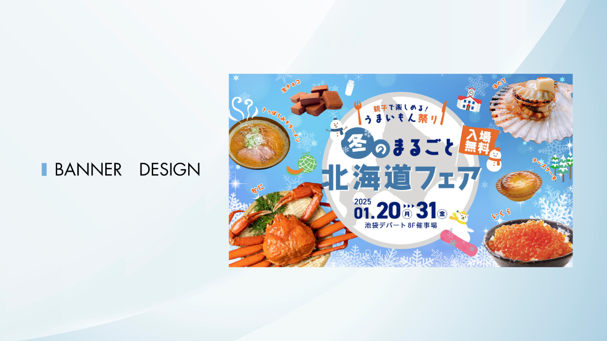 自主制作にて冬の食イベントの告知バナーを制作。 冬の屋外イベントに向けたバナー制作において、家族連れや子どもたちが思わず足を止めたくなるような「楽しさ」と「温かさ」を伝えることを意識しました。