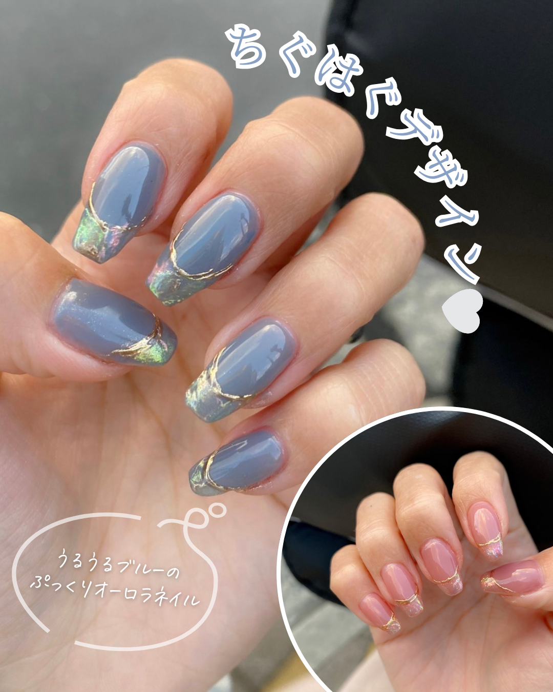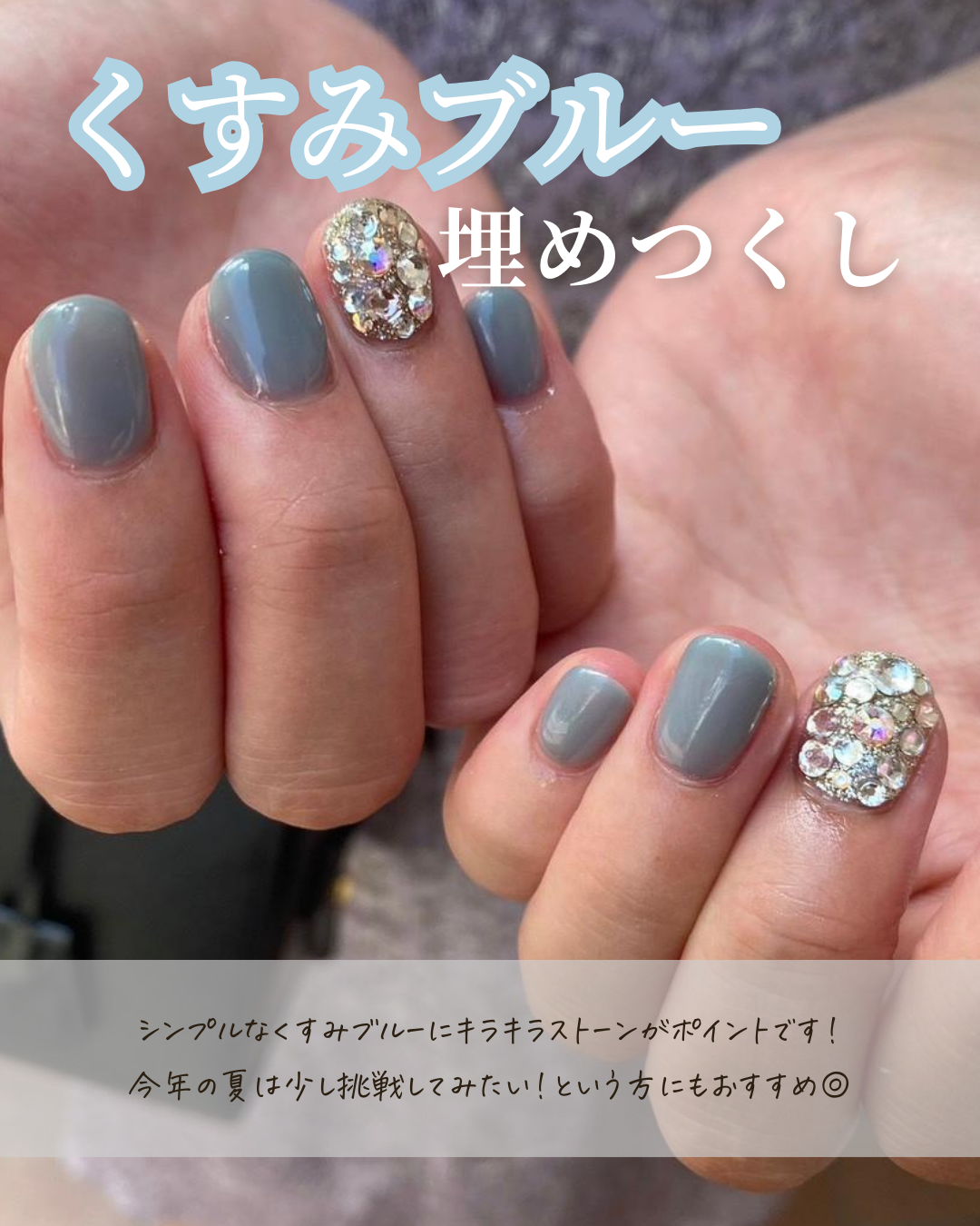 ・「くすみブルー」のネイルなので文字をブルー系にし、統一感を意識しました