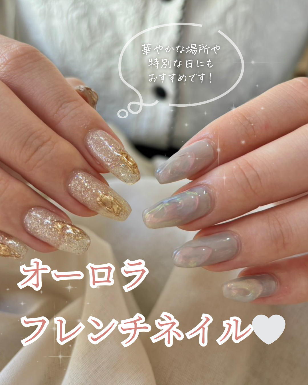 ・「オーロラ」フレンチネイルなので、表紙でも使ったキラキラを使うことで、オーロラのキラキラ感を演出するとともに、全体の統一感意識しました