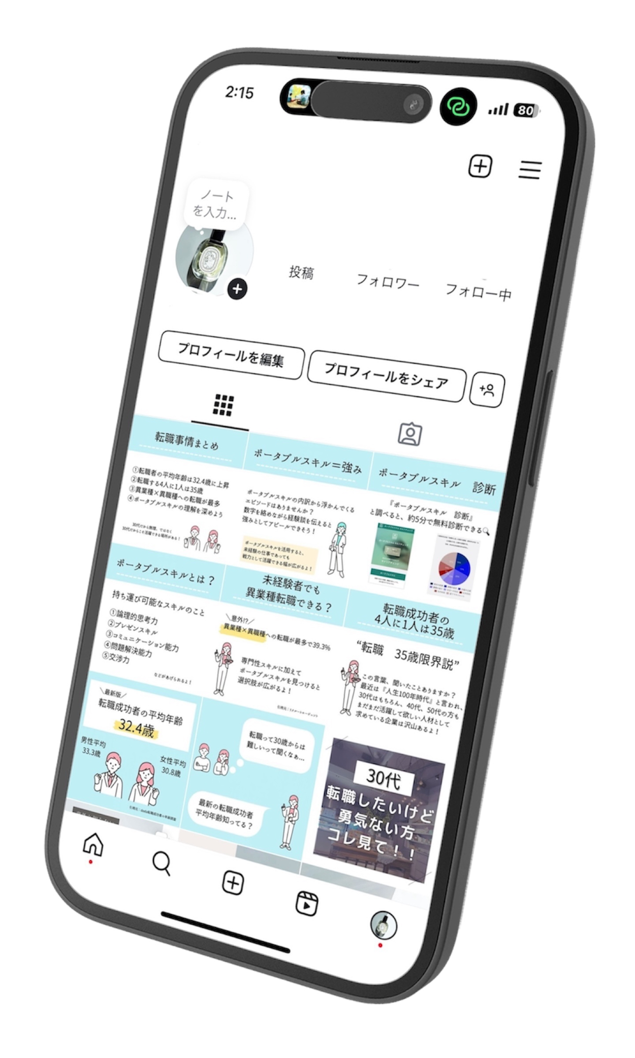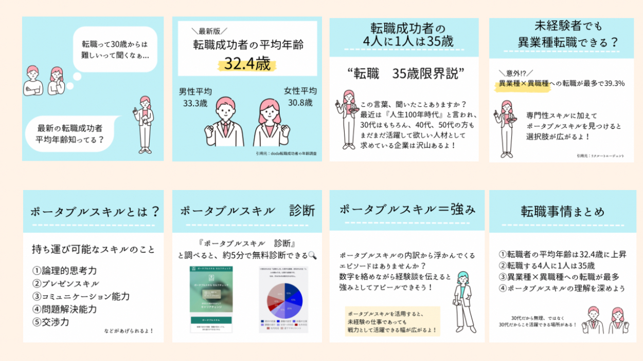 人材紹介会社在籍時にインスタグラム投稿デザインを作成いたしました。 [制作時間(分析・調査含む):6時間/制作期間:2日/使用ツール:Canva]