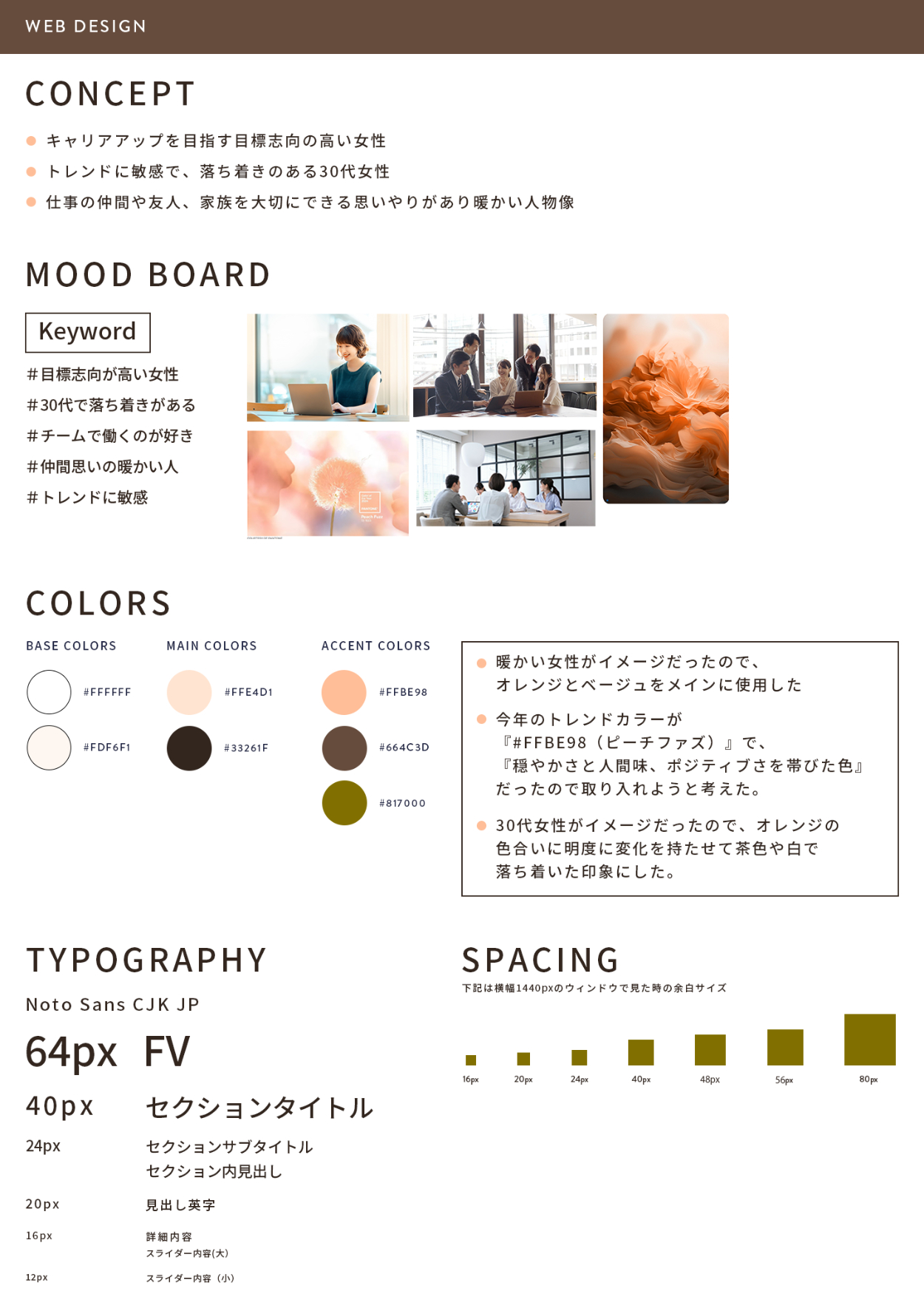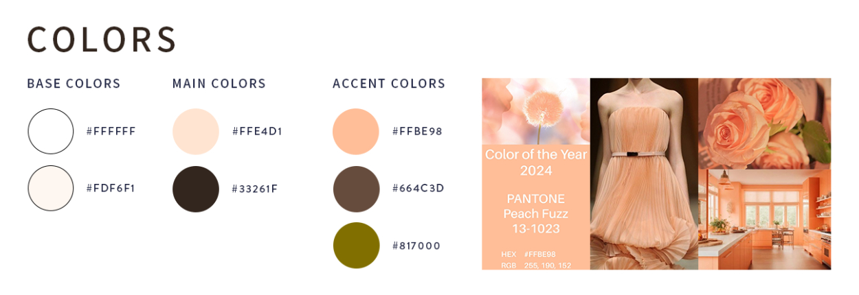 仲間思いの暖かい印象にマッチすればいいなと思いオレンジやベージュをメインに使用しました。また、今年(2024年)のトレンドカラーが『#FFBE98(ピーチファズ)』でピーチファズは『穏やかさと人間味、ポジティブさを帯びた色』とのことだったので取り入れようと考えました。