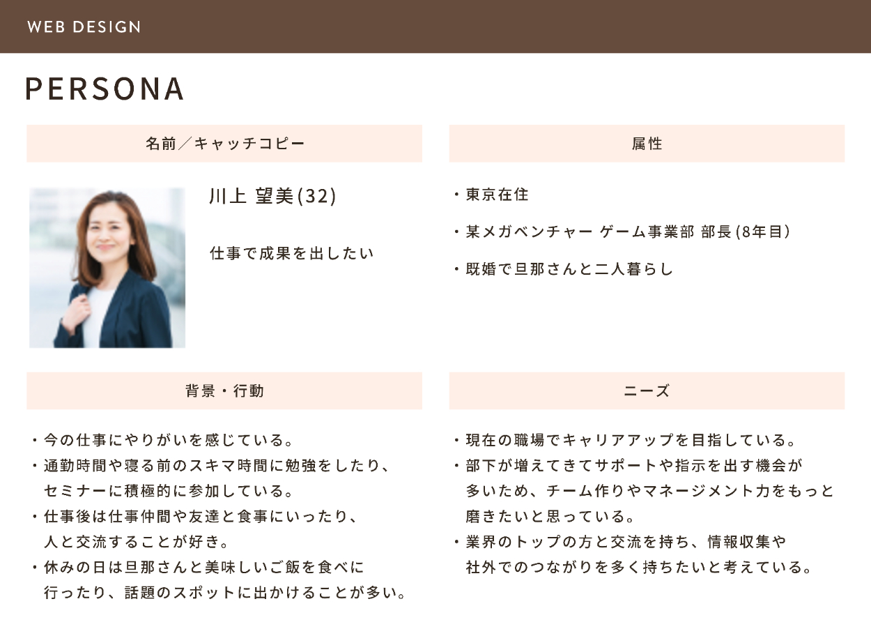 ペルソナに、チームで働くことが好き、トレンドに敏感な女性を設定しました。