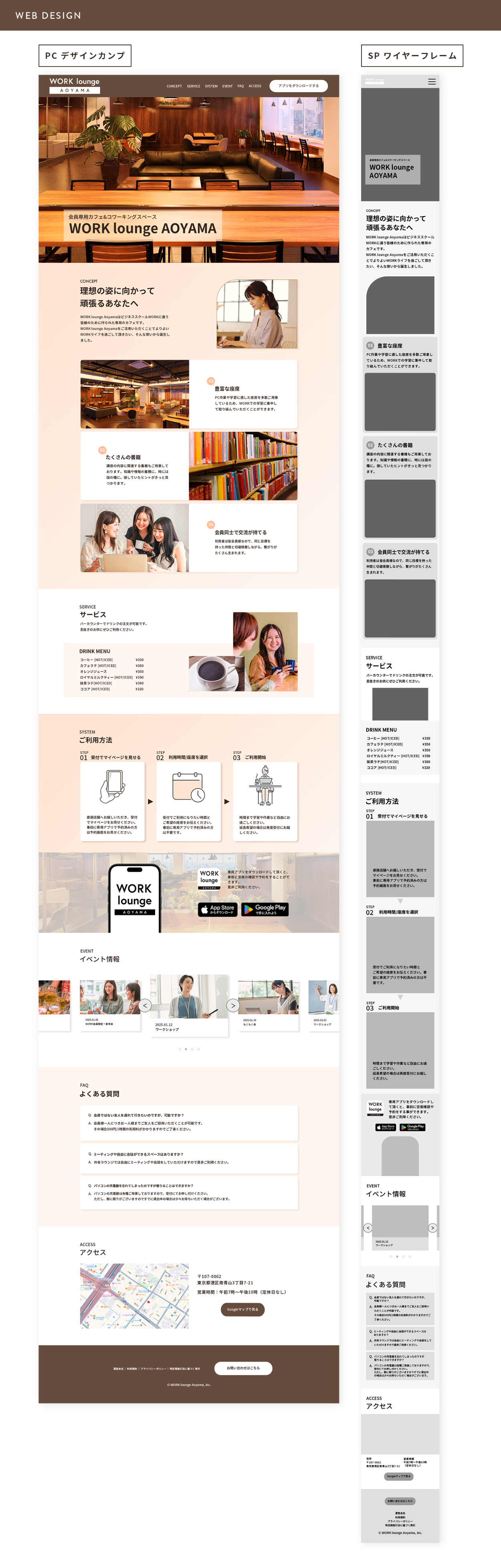SHElikes MULTI CREATOR PROJECT にて会員専用カフェ&コワーキングスペース(架空)のLP制作に取り組みました。PC デザインカンプ、SP ワイヤーフレームを制作しました。