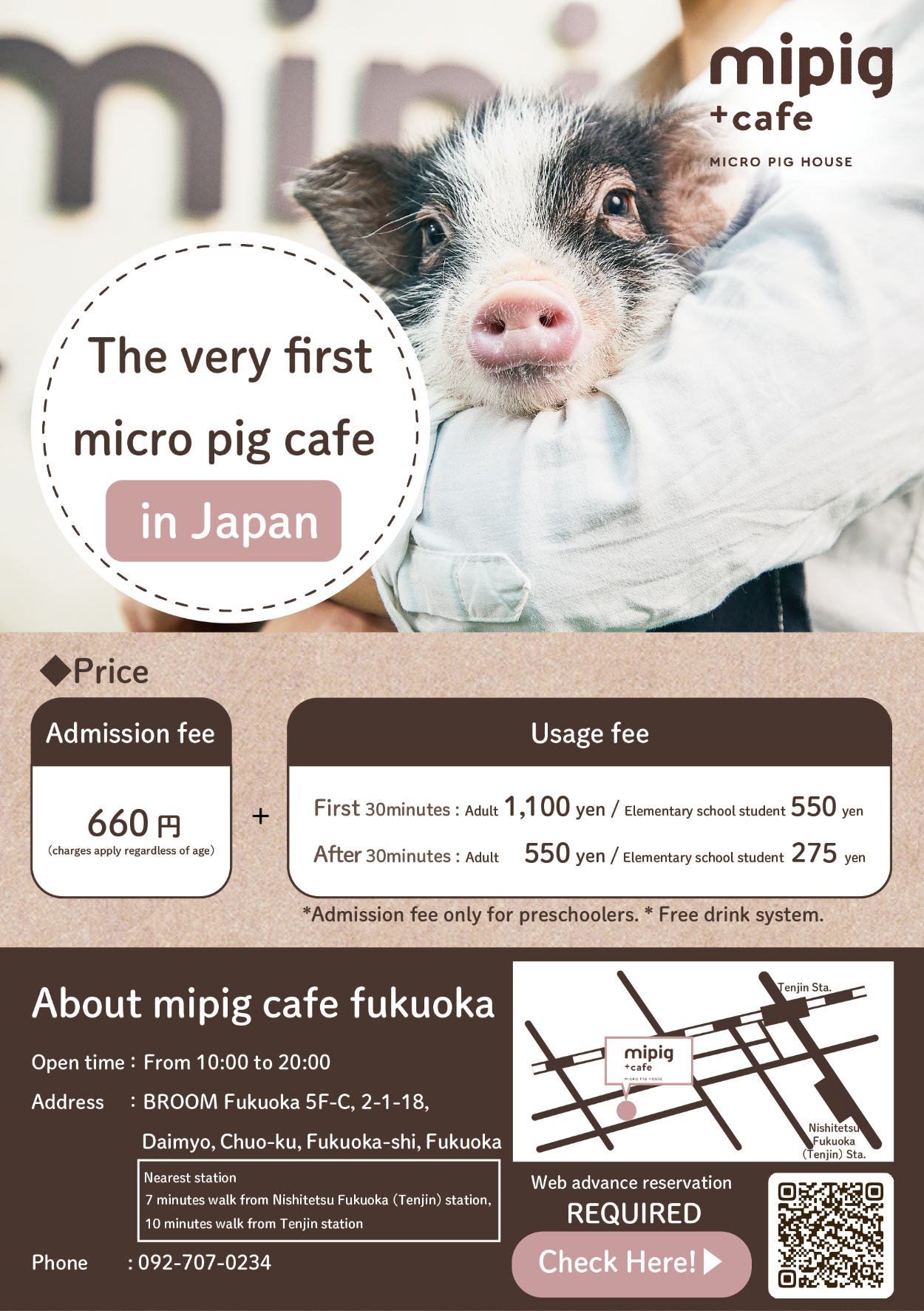 - 人がブタさんを抱いている画像を使用することで視覚的にブタさんと触れあえる楽しいお店の雰囲気が伝わるチラシにしました。