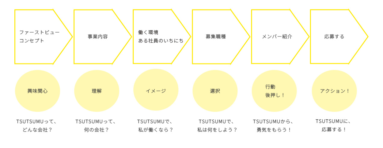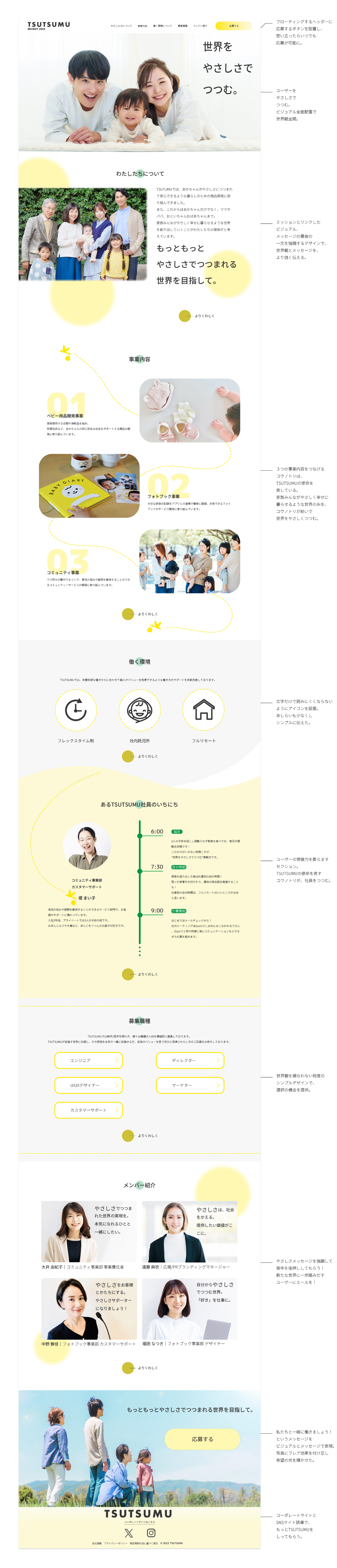 ○ファーストビュー:TSUTSUMU株式会社の社風とコンセプトを表す写真で興味を持ってもらい、画面をスクロールしてもらう。