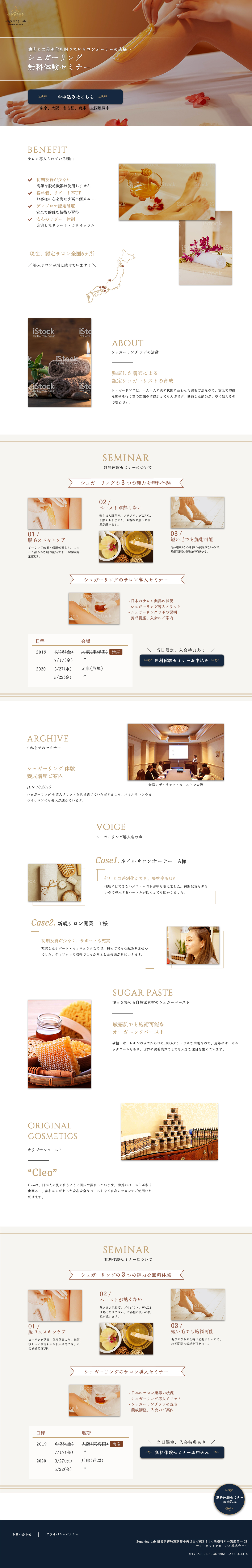 強み、他社との差別化 : 高級感(全体のデザイン)、無料体験の実施(SEMINAR,ARCHIVE)、高度な技術(ABOUT)、オリジナルペーストの使用(ORIGINALCOMSETICS)、初期投資の少なさ,サポート体制(BENEFIT