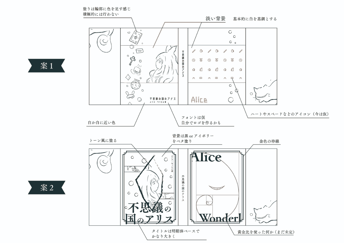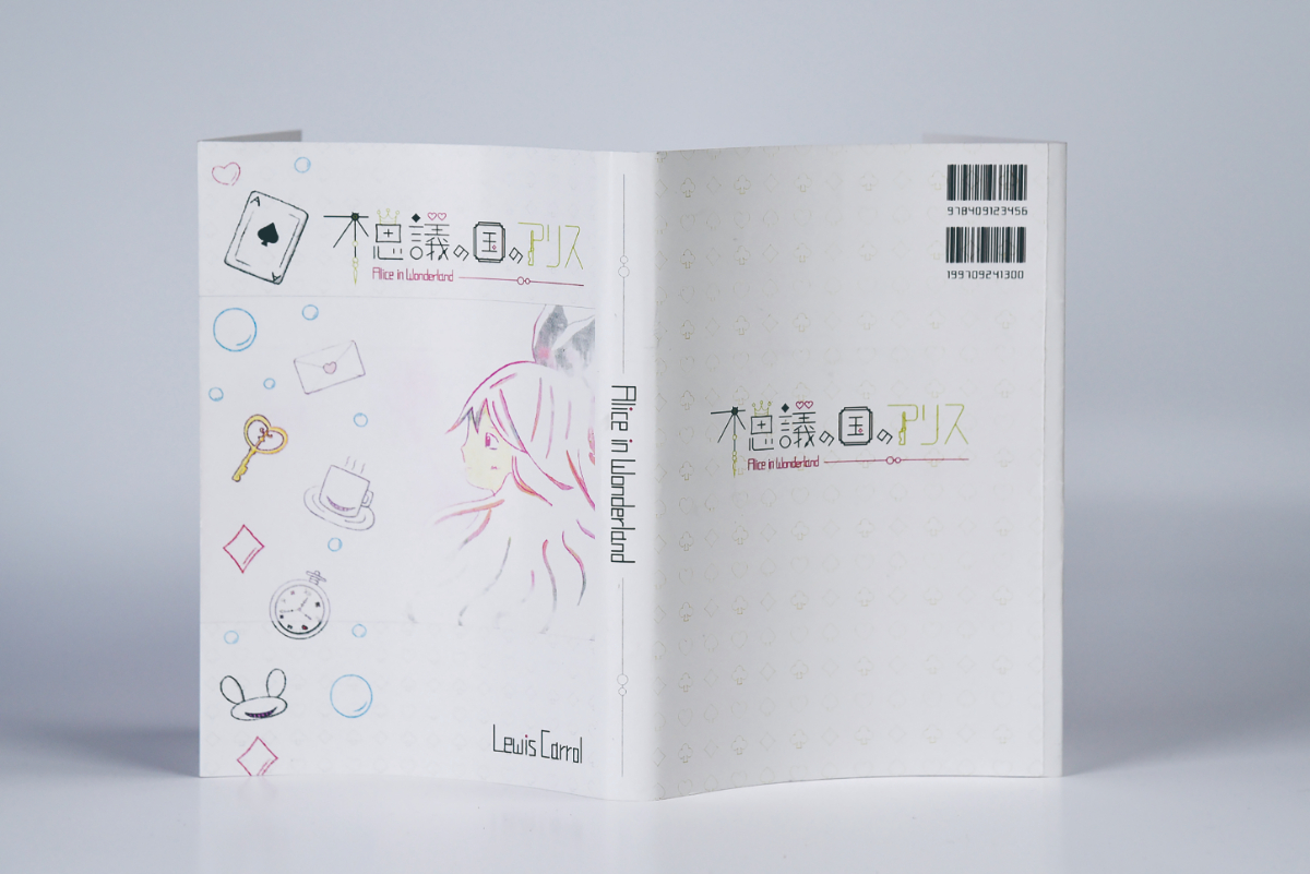 そこでターゲットを大学生や高校生などの若者に絞り、おしゃれでかわいく、かつ現代風になるようにデザインした。またタイトルのロゴも自分で制作した。白を基調とし柔らかい線と色で描くことで、誰が見ても可愛いと思えるようなイラストを心がけた。逆に帯は対照的に赤一色でベタ塗りし、タイポグラフィを載せることで不思議の国に潜む不気味な側面も表現した。