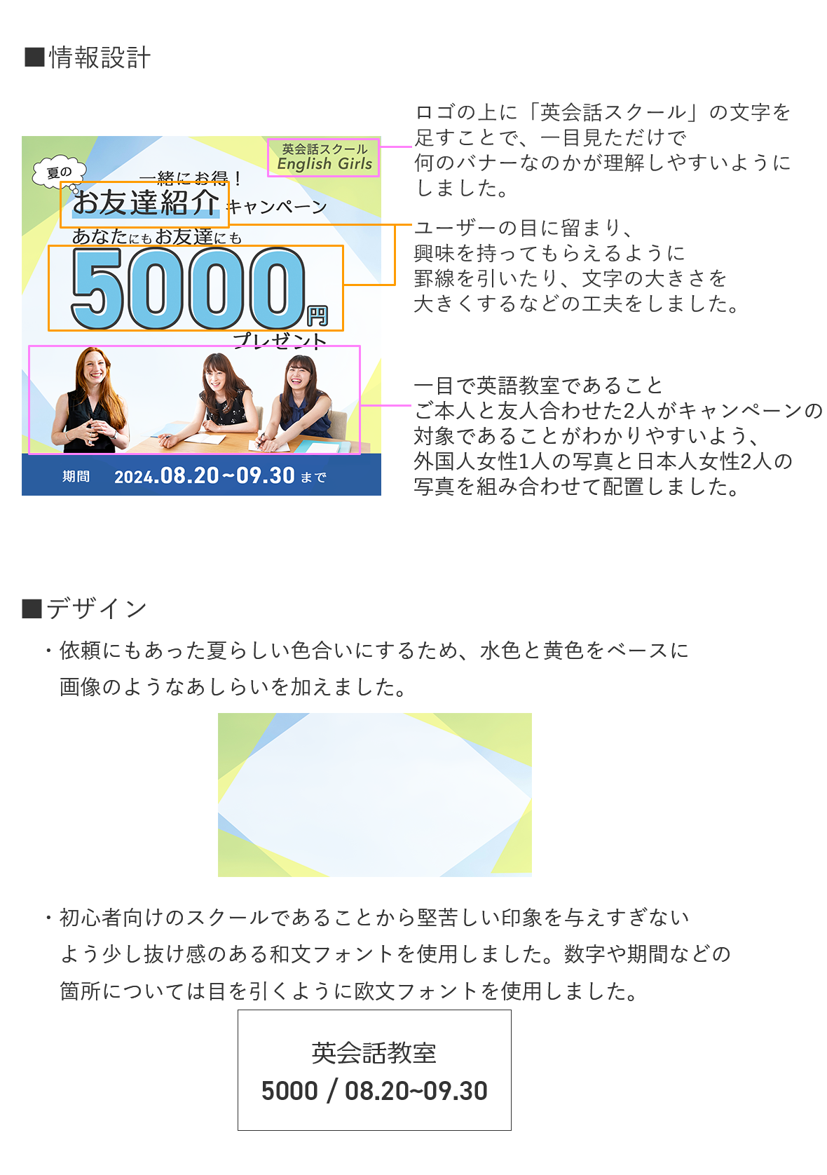 ・一番初めにどの情報を読み取ってもらいたいか、バナーを見たユーザーの立場に立って情報設計を行うことの重要性を実感しました。
