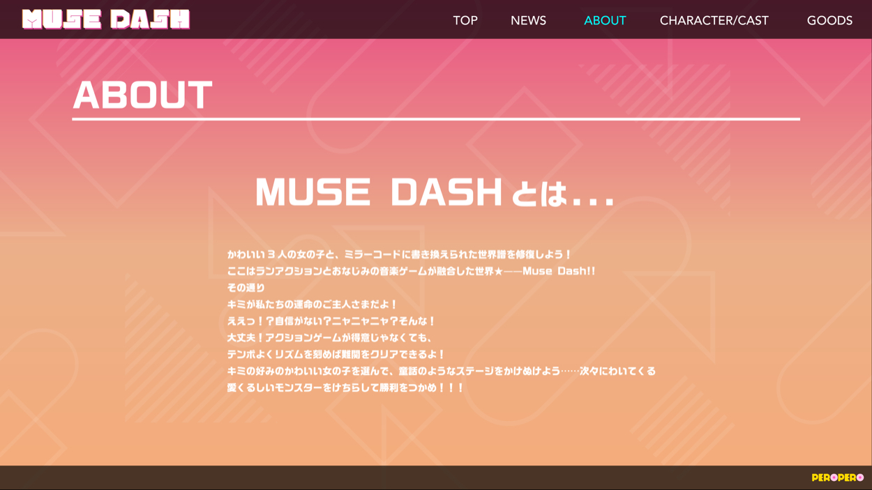 「Muse Dash」をプレイしいるユーザーはもちろん、知らない人でもどんなゲームなのかが分かるようにゲームについての説明、ニュースやグッズ情報を掲載しています。
