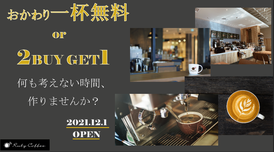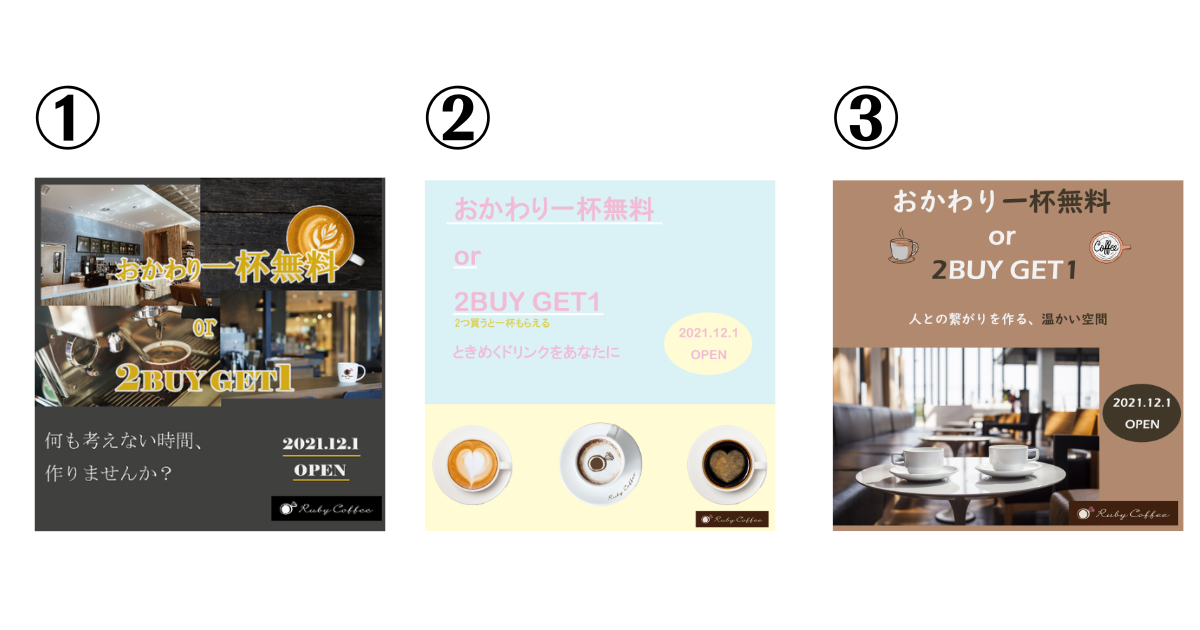 - 「おかわり一杯無料or 2BUY GET1」の文字は下線を引き、より目が引くようにした。