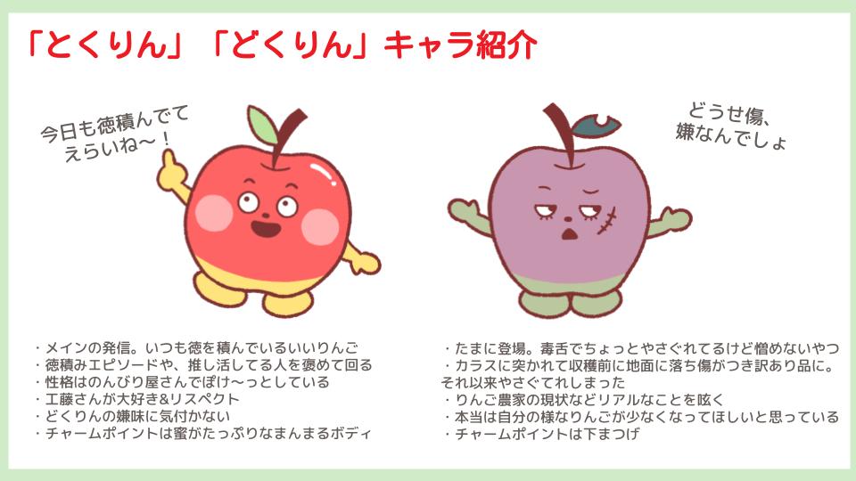 青森県津軽地方の小さなりんごの町からはじまった、りんごを通じて相手の笑顔と健康を思いやる人たちの総称「AppleGifters」がお届けする「とくつむ」りんごのキャラクター、とくりん・どくりんをデザインしました。チームTUMMYがとくつむりんごの応援団をしています。