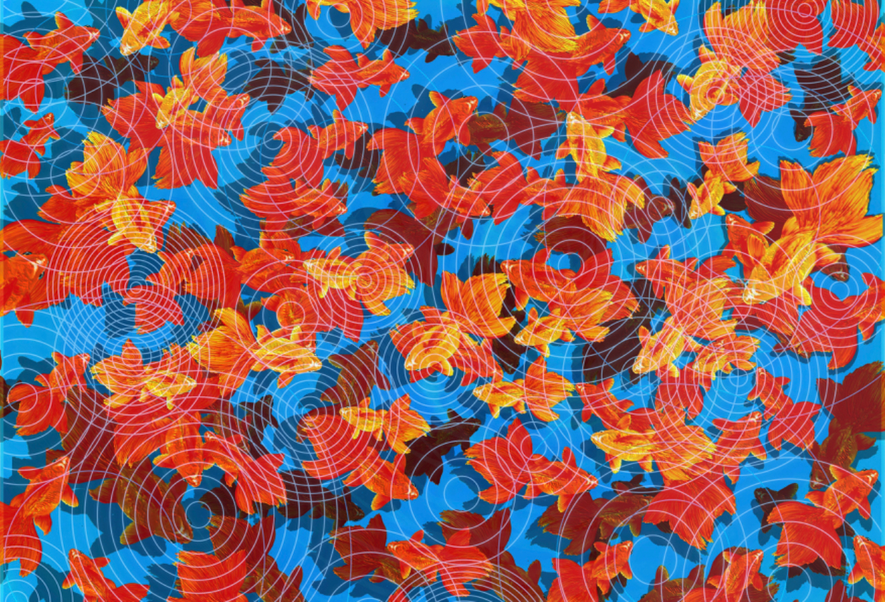 水面の波紋をillustrator で制作し、photoshopで金魚と水底を描いて、重ね合わせました。夏祭りの金魚すくいで泳ぐ金魚をイメージしながら描きました。2020,3作成。
