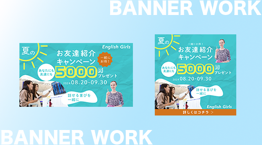 SHElikes MLUTI CREATOR COURSEでの課題 英会話教室の友達紹介キャンペーンの広告バナーの制作に取り組みました。