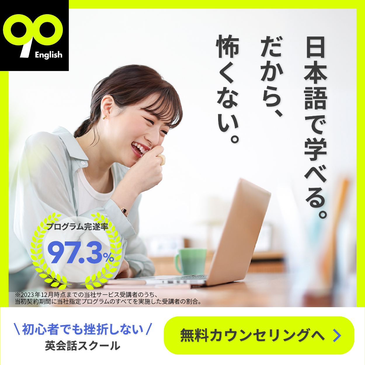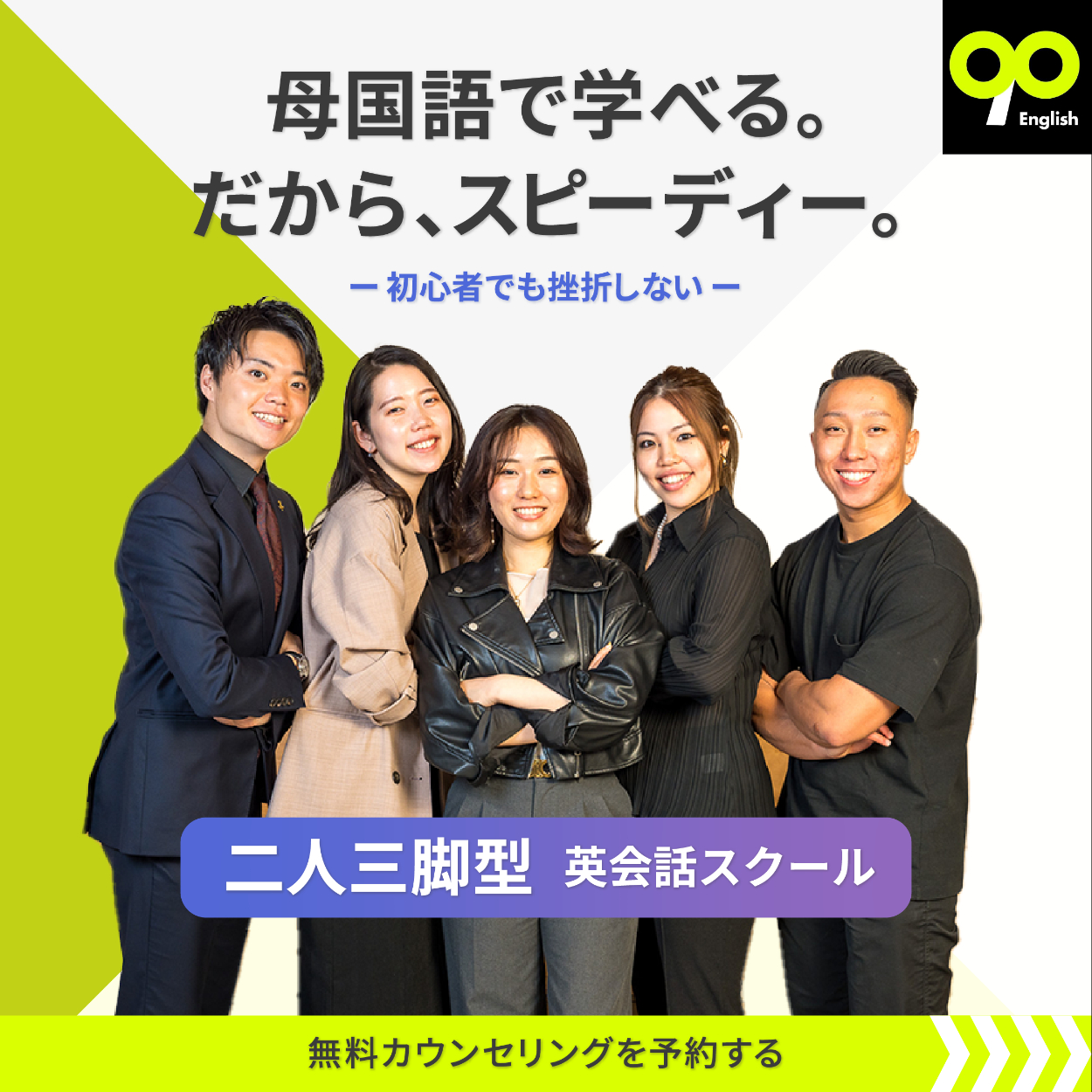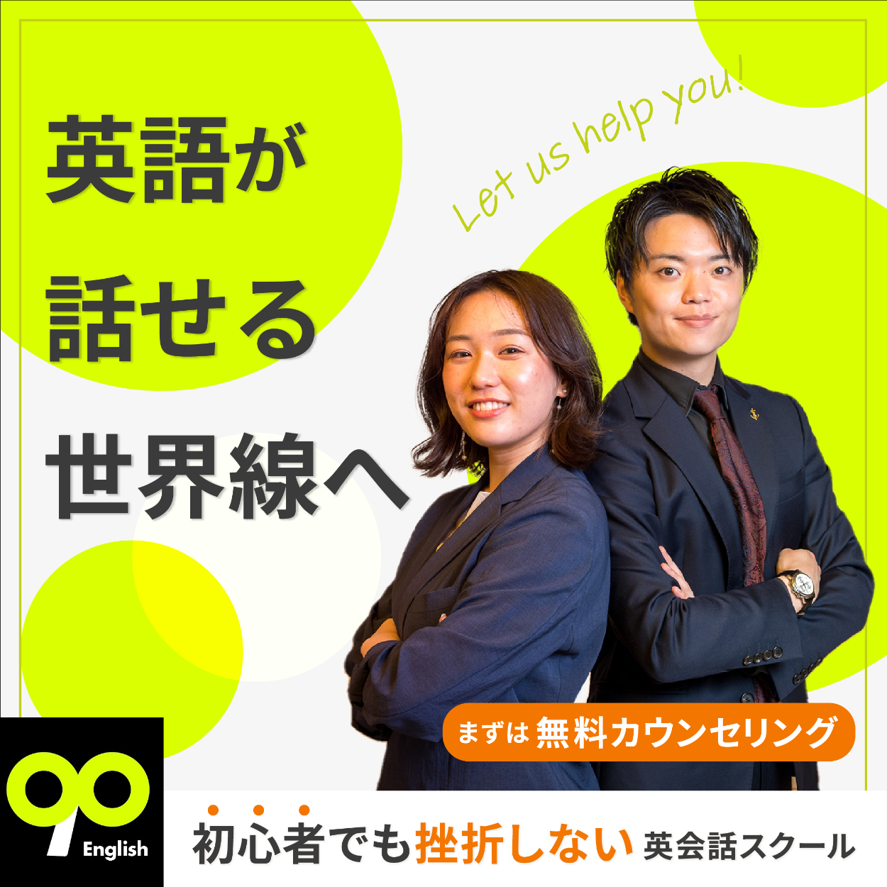 【※自主制作】 英会話スクール『90 English』様の広告バナーを自主制作しました。(3パターン) ◯制作期間:各4時間 ◯使用ツール:Illustrator Photoshop