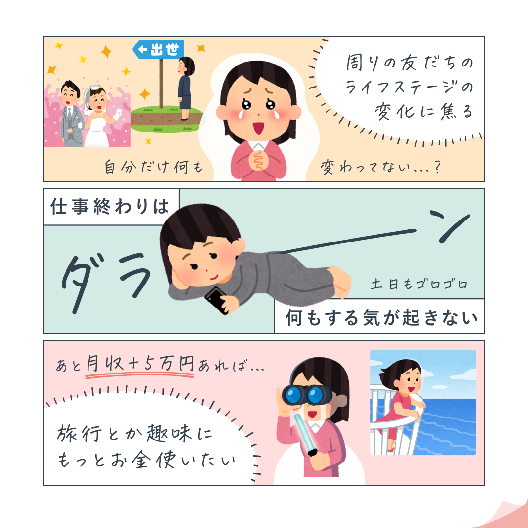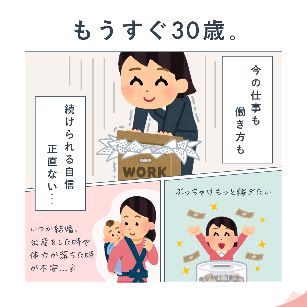 - コマ割りと”もうすぐ30歳”をタイトルのように配置することで、一目で漫画なのかな?と思わせ、続きが読みたくなるデザインにしました。
