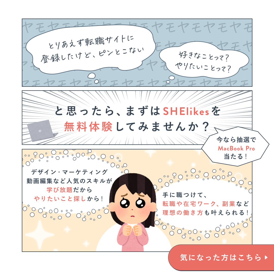 SHE株式会社様が運営する女性向けキャリアスクール「SHElikes」体験レッスンへの誘導を目的としたSNS広告バナーを制作しました。 使用ツール:Figma、Illustrator/制作時間:約8時間/制作時期:2024年5月