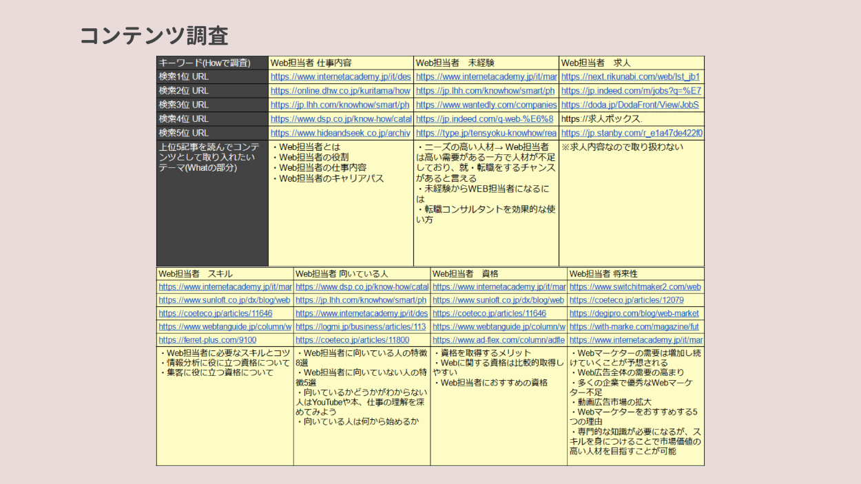 Howで調べたキーワードをシークレットモードで検索し、上位5位サイトのコンテンツを書き出しました。その中からペルソナに刺さるサイトを制作するために取り入れたいコンテンツを書き出しました。