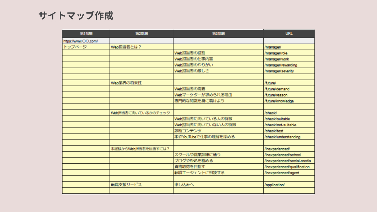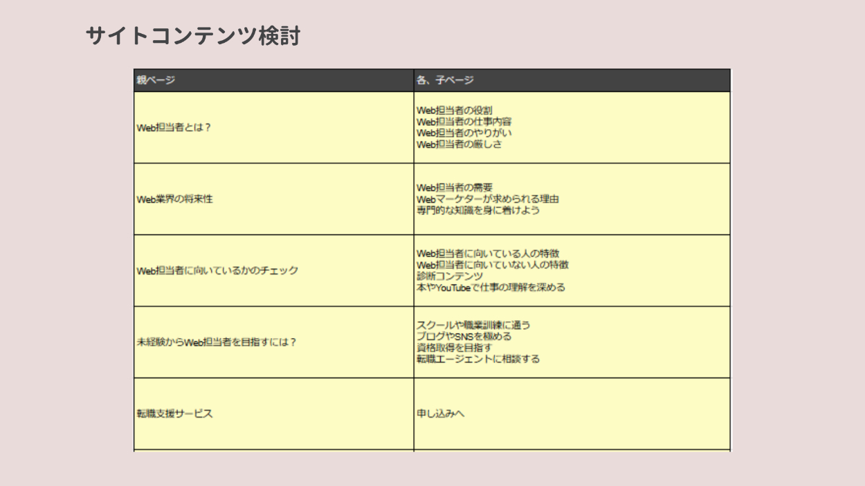 今まで調べた内容をもとにサイトコンテンツを検討しました。