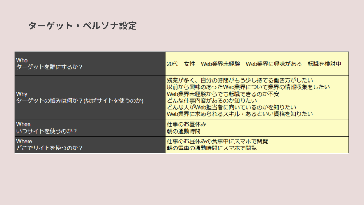 職業訓練校の課題にて作成しました。内容は、自社のオウンドメディア(Web担当者向けの転職メディア)を作成し、転職支援サービスの申し込みに繋げるという設定で行っております。