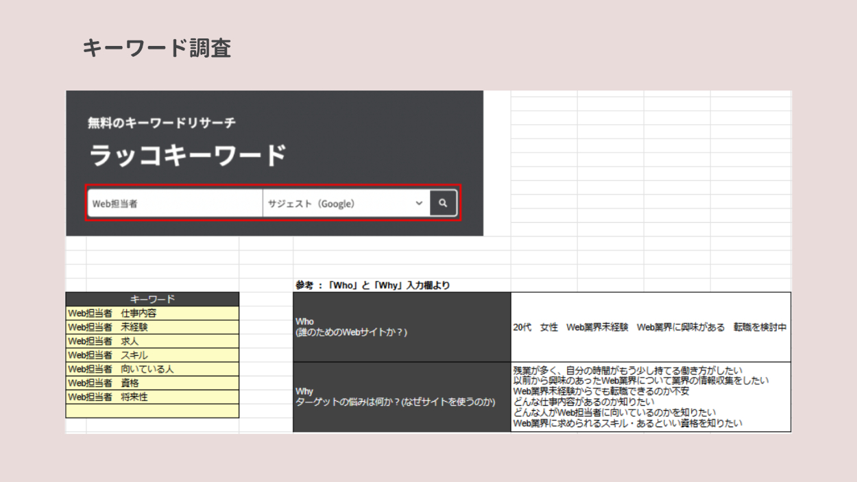 ラッコキーワードを使ってGoogleサジェストを調べました。そしてペルソナが調べそうなキーワードを選定しました。