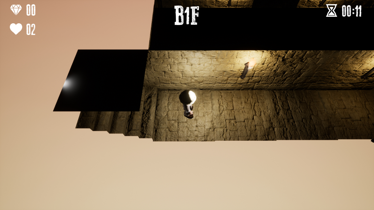 ポイント:先に何があるかわからない、見通せない、という主人公の状況と同じく、探索感を出す雰囲気作りにこだわりました。音に立体感を出すためのサウンド調整や、雰囲気を出すための光の加減、カメラ位置などに気をつけています。また、「プレイヤーにストレスを与えず、かつ、もう少しでクリアできるかもと思わせる難易度」になるよう罠が発動するタイミングを調整しました。
