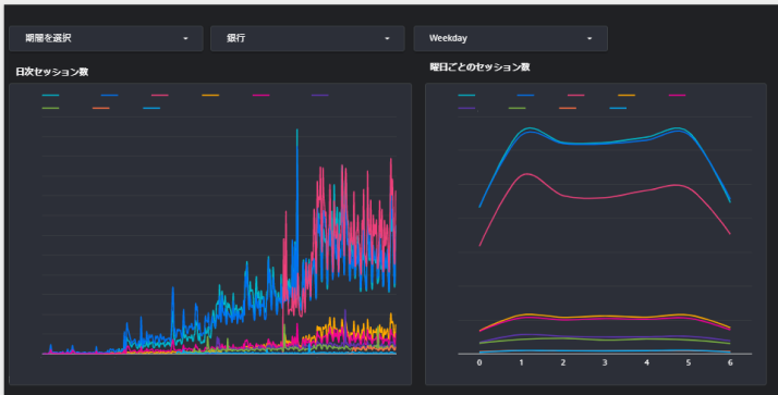 アプリ指標ダッシュボード monally マーケター OVERVIEW リリースした各銀行アプリのセッション数などを表示 YEAR 2020 リリースしたアプリのセッション数、ユーザー数、アクティブ率、利用機能数などを可視化営業担当が利用しやすいように、Google Data Portalで構築。自分の担当先にだけ絞って表示したり、期間選択したり、など。