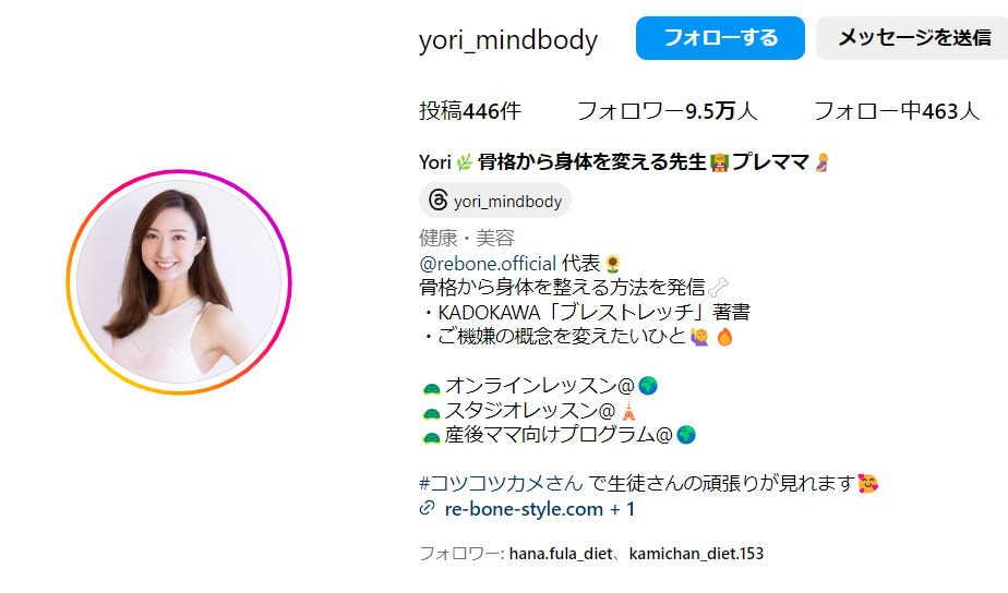 Re-bone様 Instagram投稿作成 Saki 美容トレーナ・マルチクリエイター OVERVIEW https://www.instagram.com/yori_mindbody/?hl=ja 投稿画像制作アカウントの方向性決め実際に数値を見ながらの運用 WEBSITE