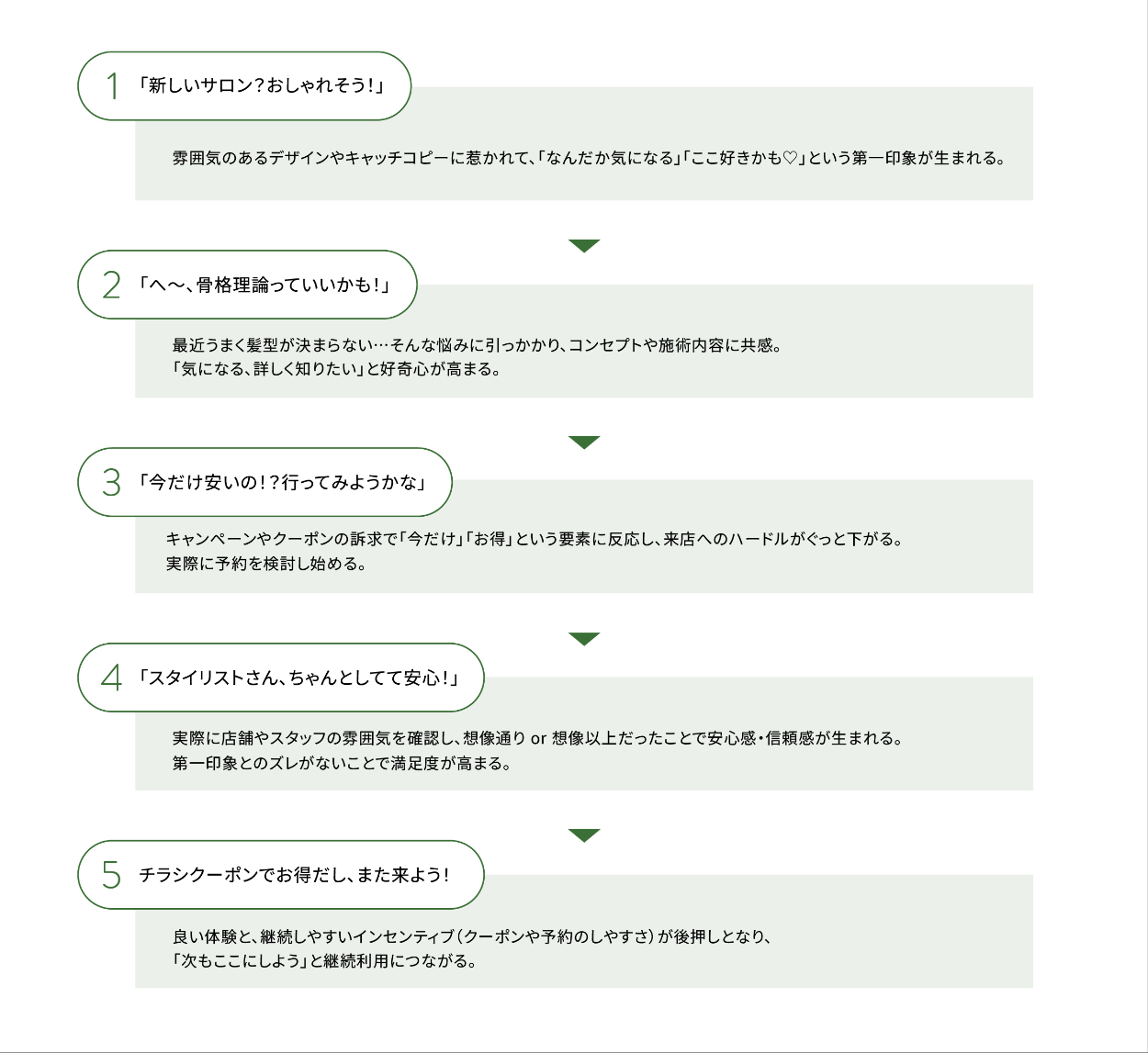 予約フォームやInstagramのQRコードを掲載し、チラシを見た人が美容院の情報に素早くアクセスできるようにしました。直接予約やSNSの閲覧につながる導線を作ることで、認知度の向上と集客の促進を図っています。