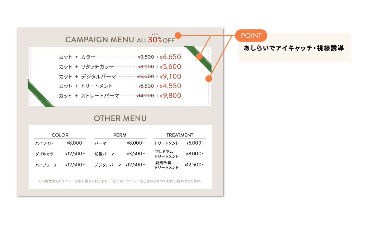 キャンペーンメニューでは、「ALL30%OFF」の表記やリッチなリボンのあしらい、波線の枠線を取り入れることで、視認性を高め、目に留まりやすいデザインに仕上げています。