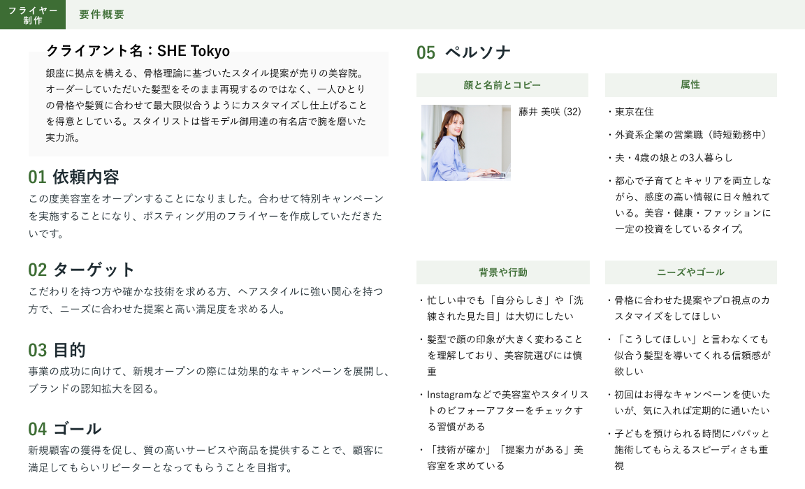 SHElikes PRO デザイナーの演習課題で新しくオープンする架空の美容院 SHE Tokyoのフライヤー制作課題に取り組みました。