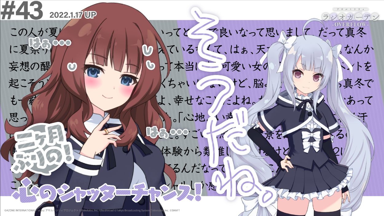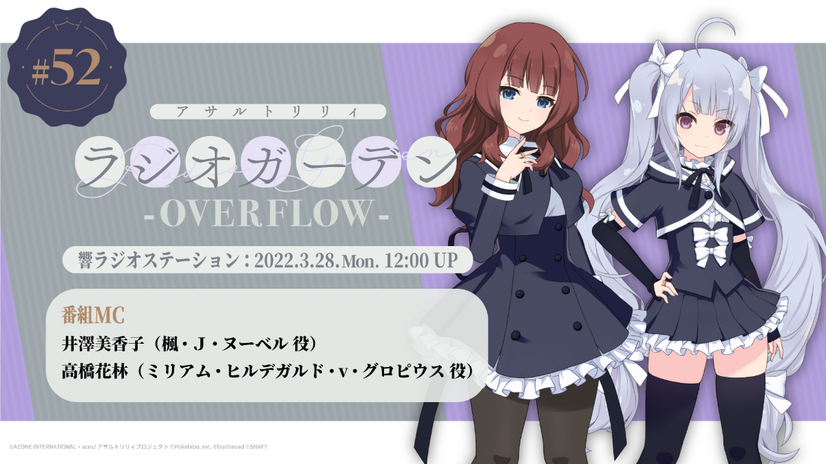 声優ラジオ「アサルトリリィ ラジオガーデン ‐OVERFLOW-」 斎藤大資 プロモーション OVERVIEW 企画/進行 毎週月曜日配信(終了) 声優ラジオの企画と進行およびプロモーションを担当。パーソナリティ:井澤美香子(楓・J・ヌーベル 役)、高橋花林(ミリアム・ヒルデガルド・v・グロピウス 役)▼制作したサムネイル(抜粋)