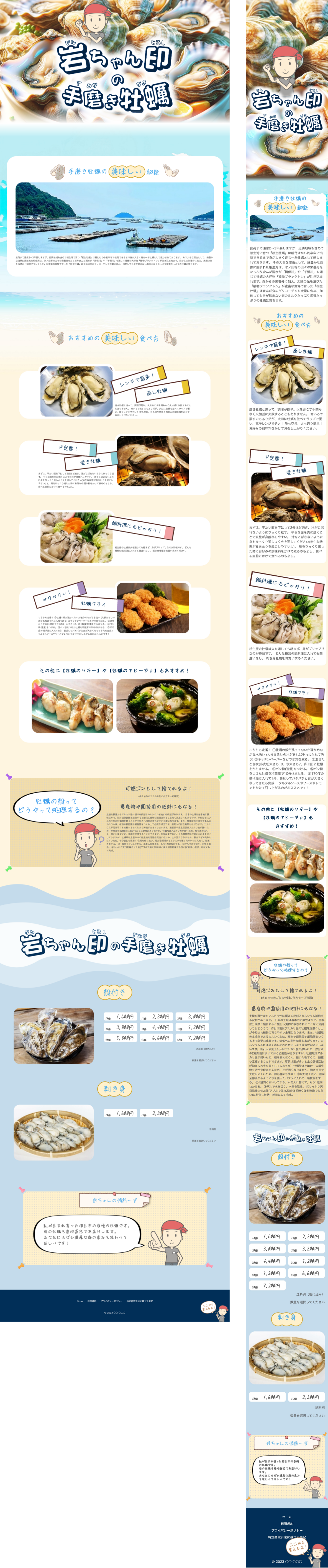 このページを見に来た人はすでに牡蠣の通信販売に興味を持っていると想定し、牡蠣の通信販売の魅力をアピールするよりもスムーズに購入画面に到達できることの方が重要と考えました。そこで、牡蠣のアピールは少なめにして料金表セクションへの誘導をわかりやすくしました。